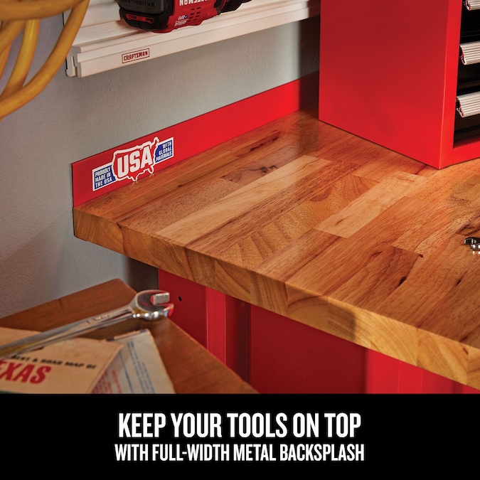 The CRAFTSMAN® 6-ft wide workbench is the perfect work table, for repair tasks and hobbies. The 1-in thick butcher block top is smooth and sturdy and can hold up to 1,450-lbs and four adjustable leveling feet keep the cabinet level on uneven floors. Our workbench also features a full-width metal backsplash which prevents tools from rolling off the back of the work surface and to maximize your garage storage there’s plenty of space for two CRAFTSMAN® rolling tool cabinets measuring 35.7-in in height or less under the work surface. Casters are not included.