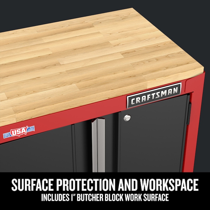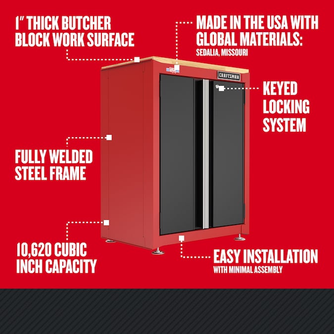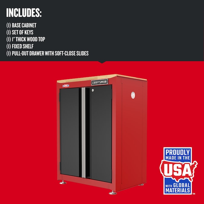 Proudly made in the USA with global materials in Sedalia, Missouri. This cabinet has a fully welded frame for durability and strength with minimal assembly required. Taller than most comparable base cabinets and with an 800-lb. total storage capacity, it provides plenty of storage space without using much floor space. The included 1-in thick butcher block work surface provides a durable project work space.
