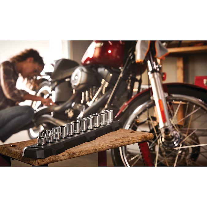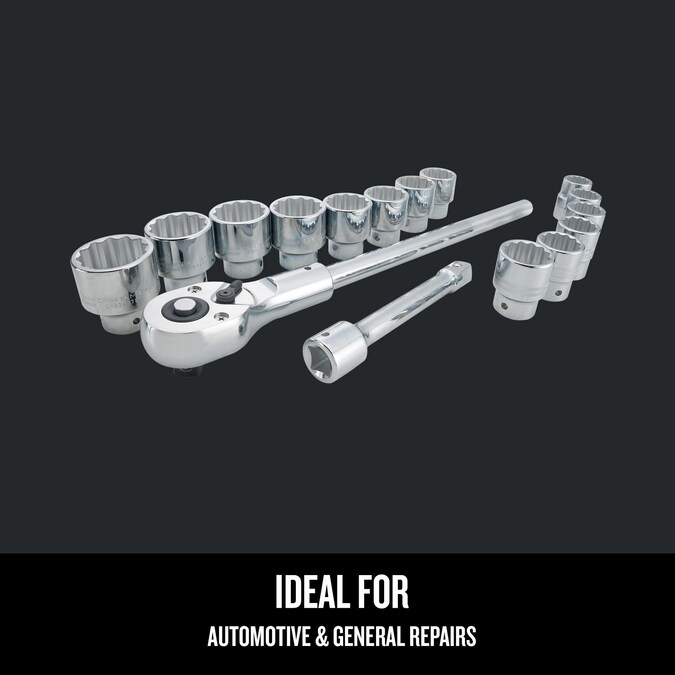 - Includes (14) 3/4-in Drive sockets SAE (7/8, 15/16, 1, 1-1/16, 1-1/8, 1-1/4, 1-5/16, 1-3/8, 1-7/16, 1-1/2, 1-5/8, 1-11/16, 1-3/4 and 1-7/8-in), (1) 3/4-in Ratchet and (1) 3/4-in Drive Extension bar (8-in)