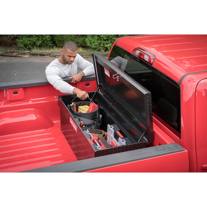The Craftsman 40 inch Black Aluminum Truck Bed Chest Box easily mounts in the bed of nearly any pickup truck, and is the perfect secure truck box when in-bed or under-tonneau secure storage is needed. The box is constructed of heavy-duty 17 gauge aluminum, with a durable and abrasion-resistant Black powder-coat finish inside and out. The lockable and convenient push button handle provides easy access and extra security for your belongings. The fully-welded aluminum construction and rubber weather seal protect your items from dirt and inclement weather.