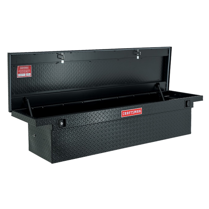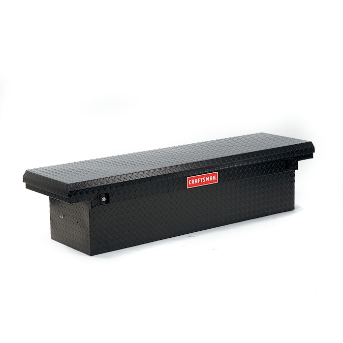 The Craftsman 71 inch Black Aluminum Low Proveil Crossover Truck Tool Box conveniently mounts on most full-size pickup truck bed rails, directly behind the cab. The box is constructed of heavy-duty 17 gauge aluminum, with a durable and abrasion-resistant Black powder-coat finish inside and out. The lockable and convenient push button handles provide easy access and extra security for your belongings. The fully-welded aluminum construction and rubber weather seal protect your items from dirt and inclement weather.