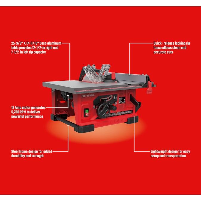 Craftsman 8-1/4 in. table saw has a powerful 13- amp motor that generates 5700 RPM designed for cutting various wood working materials with precision for jobsite and workshop task.