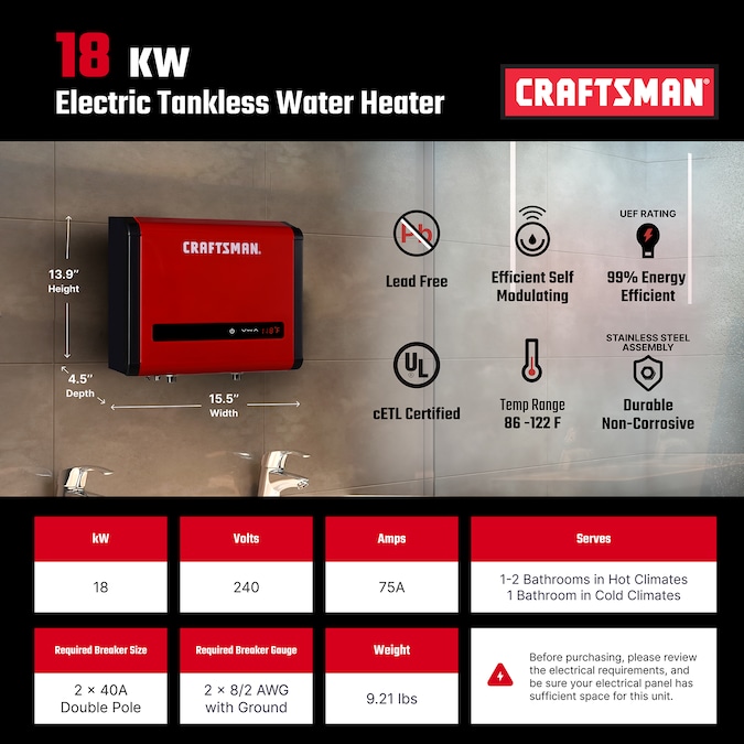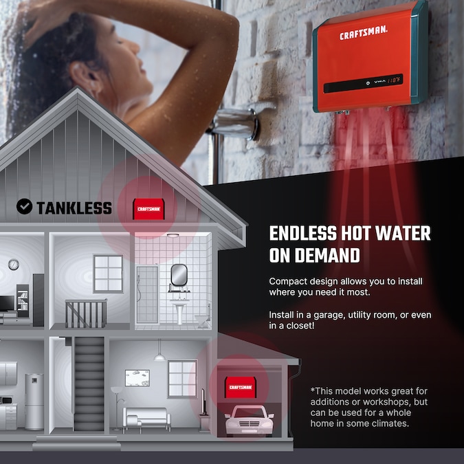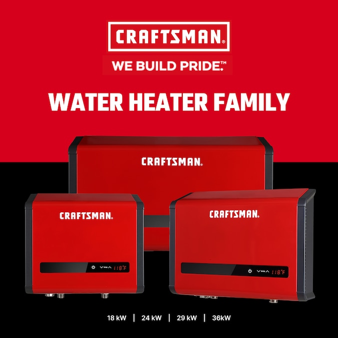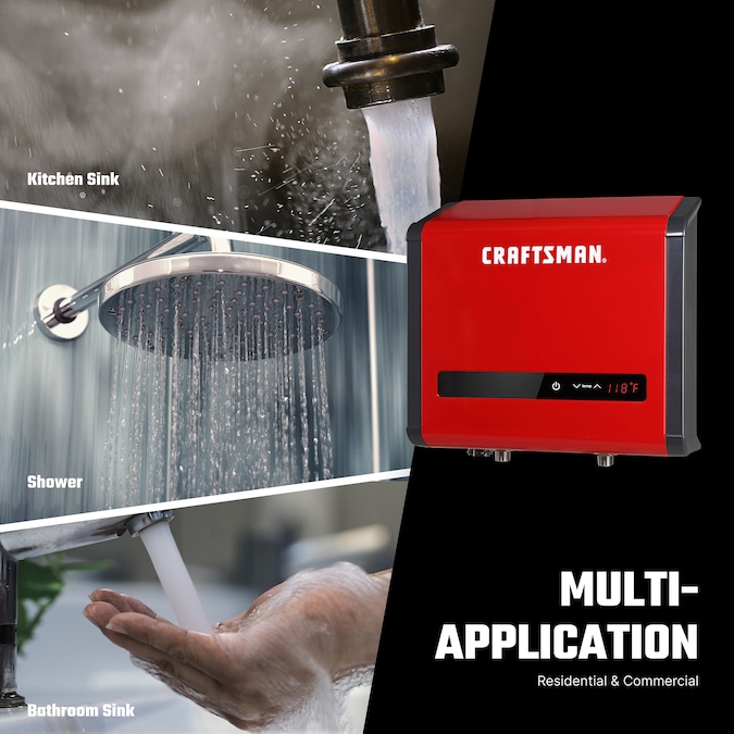 CRAFTSMAN continues to build pride and improve your quality of living with the convenience, efficiency, and comfort of our digital tankless electric water heaters. Running out of hot water should never be a worry again and now you can now enjoy a continuous supply of hot water only when you need it – all while reducing energy usage, saving up to 50% on energy costs and saving space. The advanced “on-demand” water heating technology will automatically turn on when sensing water flow into the unit and turn off when the flow ceases. Since our tankless water heaters heat water directly without the use of a storage tank and do not require gas lines or ventilation, the sleek/compact design of this water heater allows the flexibility to install virtually anywhere within your residential or commercial environment. CRAFTSMAN electric tankless water heaters are also backed by the assurance of a worry-free 7-year leakage free and 2 years parts only warranty.