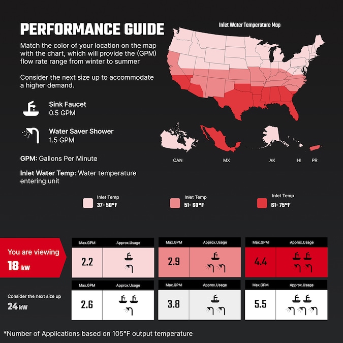 - 35° F Temperature Rise – 3.7 GPM, 45° F Temperature Rise – 2.85 GPM, 55° F Temperature Rise – 2.4 GPM