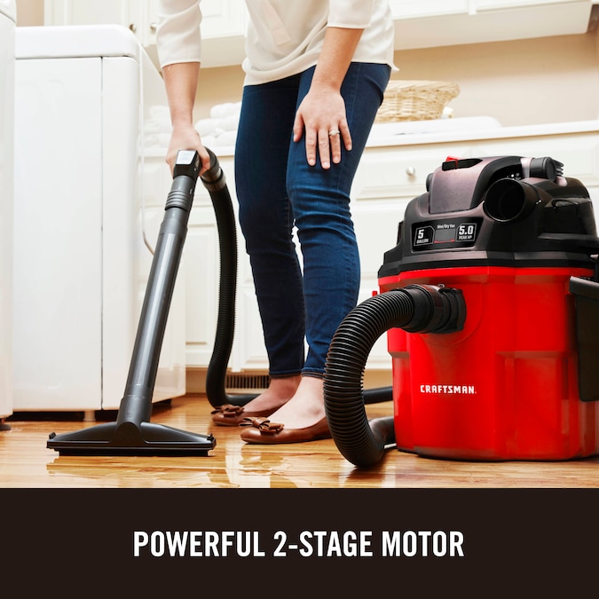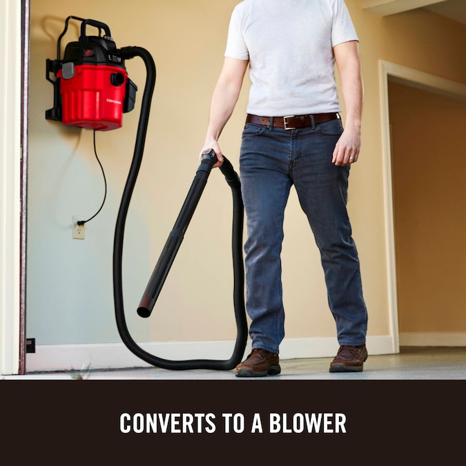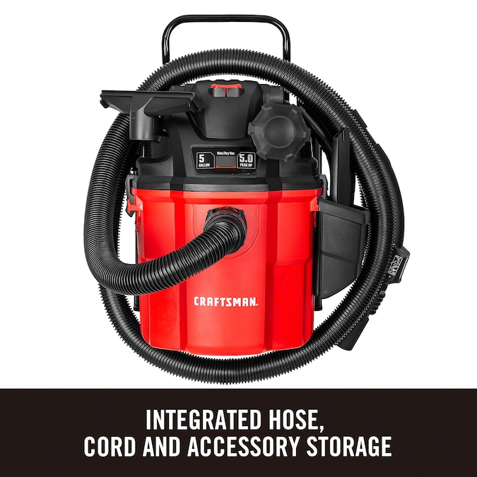 The Craftsman 5-gallon wall mount wet/dry vacuum is the perfect combination of performance and convenience. The ultra quiet, 2-stage motor is powerful enough to handle any job the home, garage, or shop can throw at you. This vacuum features an easy to use remote control setting that allows the user to turn the vacuum, on and off from the end of the contour handle. The 21-foot hose system and 20-foot power cord delivers extra-long cleaning reach, so you’re not constantly searching for power outlets. The CMXEVCVVWM510 can be stored neatly on the wall and becomes portable with the quick pull of a lever. This wet/dry vacuum comes standard with an array of attachments that all store on-board so that you’re prepared for any task.