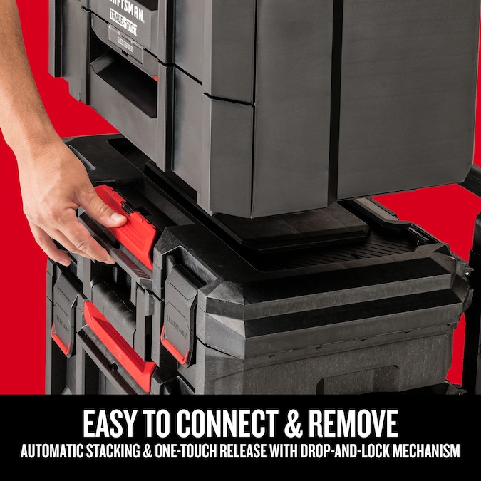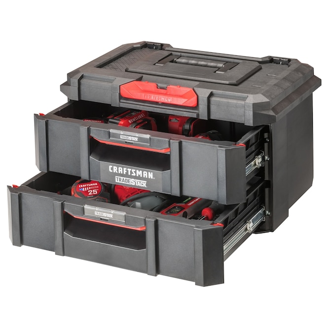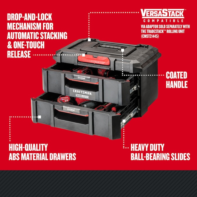 CRAFTSMAN® TRADESTACK™ System 2-Unit Drawers has a 22-in wide full size platform with a load capacity of 88lbs on handle. The ABS drawers that can hold up to 22lbs each allow your tools to be stored for on-the-go organization.
