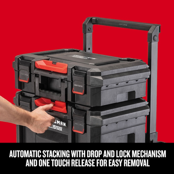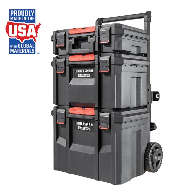 Suitable for any outdoor job or project, the TRADESTACK™ 22-in Rolling Tower Premium Storage Stack includes a suitcase, deep toolbox, and a rolling unit. The TRADESTACK™ units connect to each other, automatically stacking via a drop and lock mechanism and easily separating with a one-touch release. They are IP65 dust and water resistant, have a large storage space to fit large and heavy tools, and feature durable 7-in wheels that enable smooth mobility for convenient transport to any destination. Compatible with VERSASTACK™ modules, and CRAFTSMAN® organizers and tool sets via an included adaptor, you will be ready to meet all your stackable storage needs. Made in USA with Global Materials.