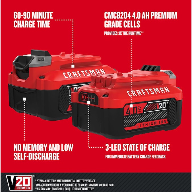 This V20 Battery Starter Kit is made with you in mind. The Battery Starter Kit offers premium grade high performance cells for improved power. No memory and low self-discharge means this battery is ready when you are. It is compatible with the CRAFTSMAN® V20 – 20V MAX cordless power tool and outdoor tool lineup.