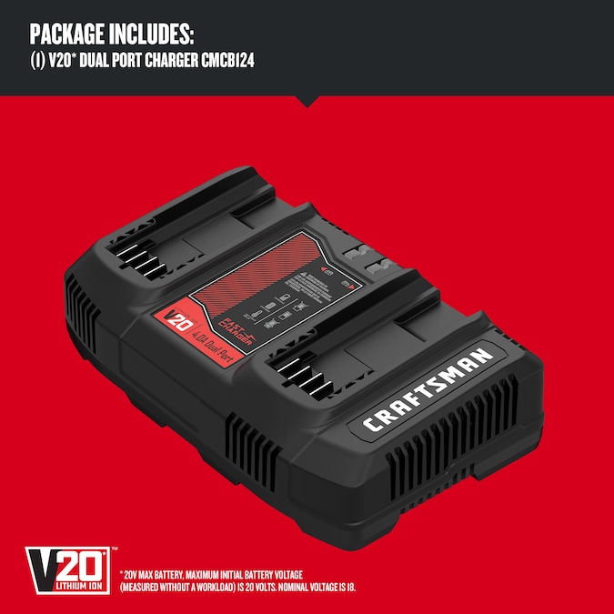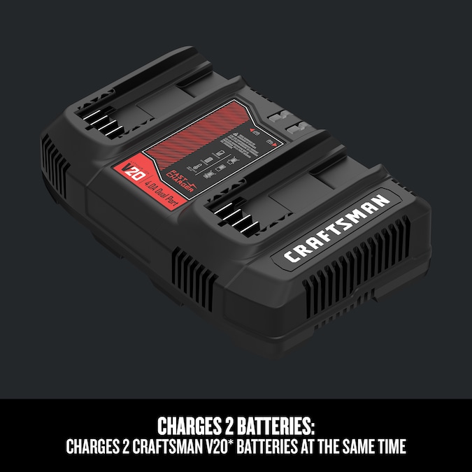 The Dual-Port Charger allows you to charge 2 Craftsman V20* batteries simultaneously. CRAFTSMAN® 20V MAX* battery includes one 2.1 Amp max output USB port to charge compatible devices. It also features an LED charge indicator to show charge status.