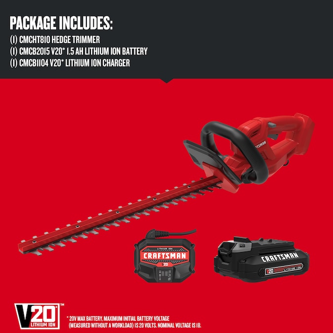 - INCLUDES: (1) CMCHT810 Hedge Trimmer, (1) V20* 1.5Ah Lithium Ion Battery, (1) V20* Lithium Ion Charger