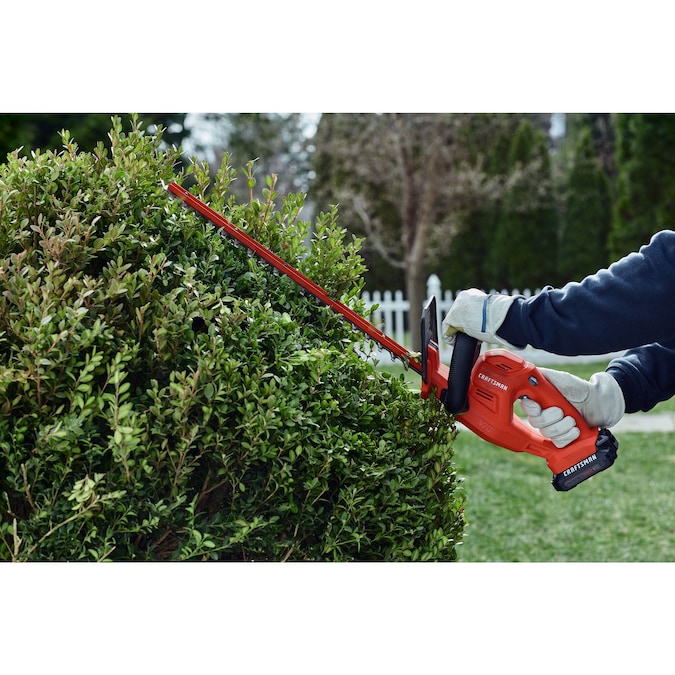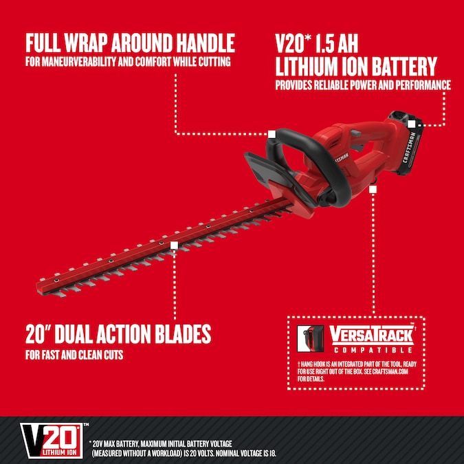 CRAFTSMAN® V20 Cordless 20-in Hedge Trimmer Kit features a reliable motor and is equipped with a 1.5 Ah battery allowing you to take on the tasks at hand. The hedge trimmer has 20-in dual action blades with up to 3/4-in cut capacity for cutting branches quickly. Once the task is complete, conveniently store using the integrated VERSATRACK™ hook with the VERSATRACK system (sold separately). V20 battery platform is compatible with CRAFTSMAN V20 Outdoor Equipment and Power Tools. You’ll find the complete line of outdoor tools and equipment essentials for a job to make you proud.