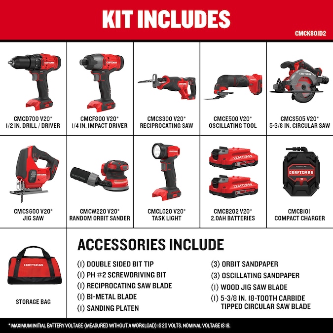 Complete a range of woodworking and metalworking jobs with this V20 Cordless 8-Tool Combo Kit. With 2 batteries and a charger included, you can start the workday with pride and confidence knowing you have the power needed to tackle a full day’s work. Drill, sand, and cut with this kit as you easily retrieve and store tools using the included storage bag, which can also be used to transport your set of tools, batteries, and chargers from one garage or workshop to another.