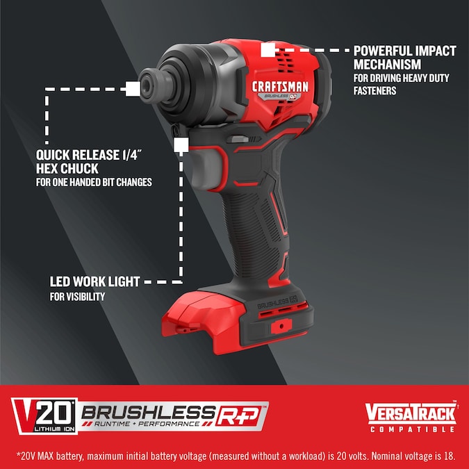 This CRAFTSMAN® V20* Cordless Brushless 1/4-in Impact Driver (tool only) has a brushless motor giving the user up to 30% more run time. Max torque and speed allow you to drive large fasteners with ease. The Impact Driver is built with the user in mind allowing easy bit changes and providing maximum control during application.