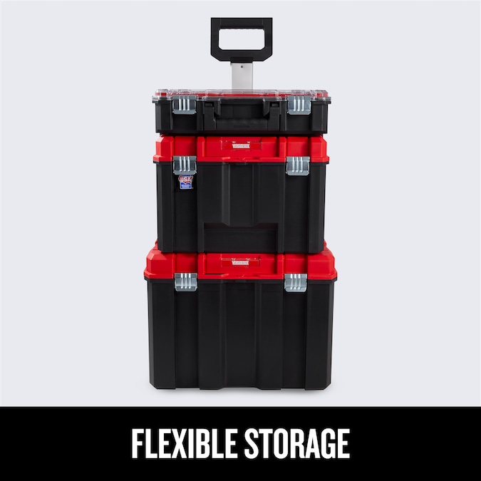 - COMPLETE MOBILE TOOL BOX: Rolling tool chest tower includes 1 extra large mobile bottom unit, 1 deep storage unit for large tools, and 1 top unit with organization compartments and a heavy duty clear lid for full visibility