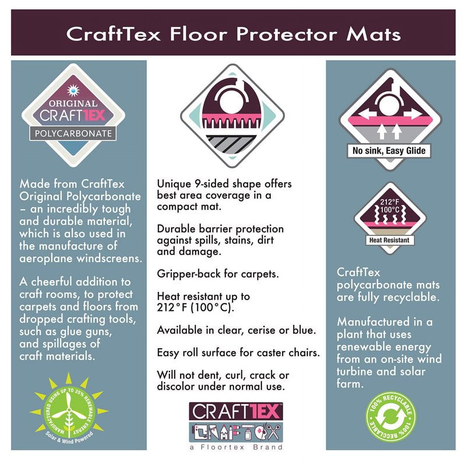 CraftTex 9Mat is suitable for compact craft areas. Its unique nine-sided shape provides excellent floor coverage and protection. This mat is made from strong polycarbonate which will not crack, dent, discolor, curl or smell. Perfect for a child’s room or small craft areas. This chair mat is recyclable, environmentally safe, free from PVC and toxic chemicals. Polycarbonate 9 sided mat to protect floors from messy craft activities. These mats are available for both carpeted and hard floors.