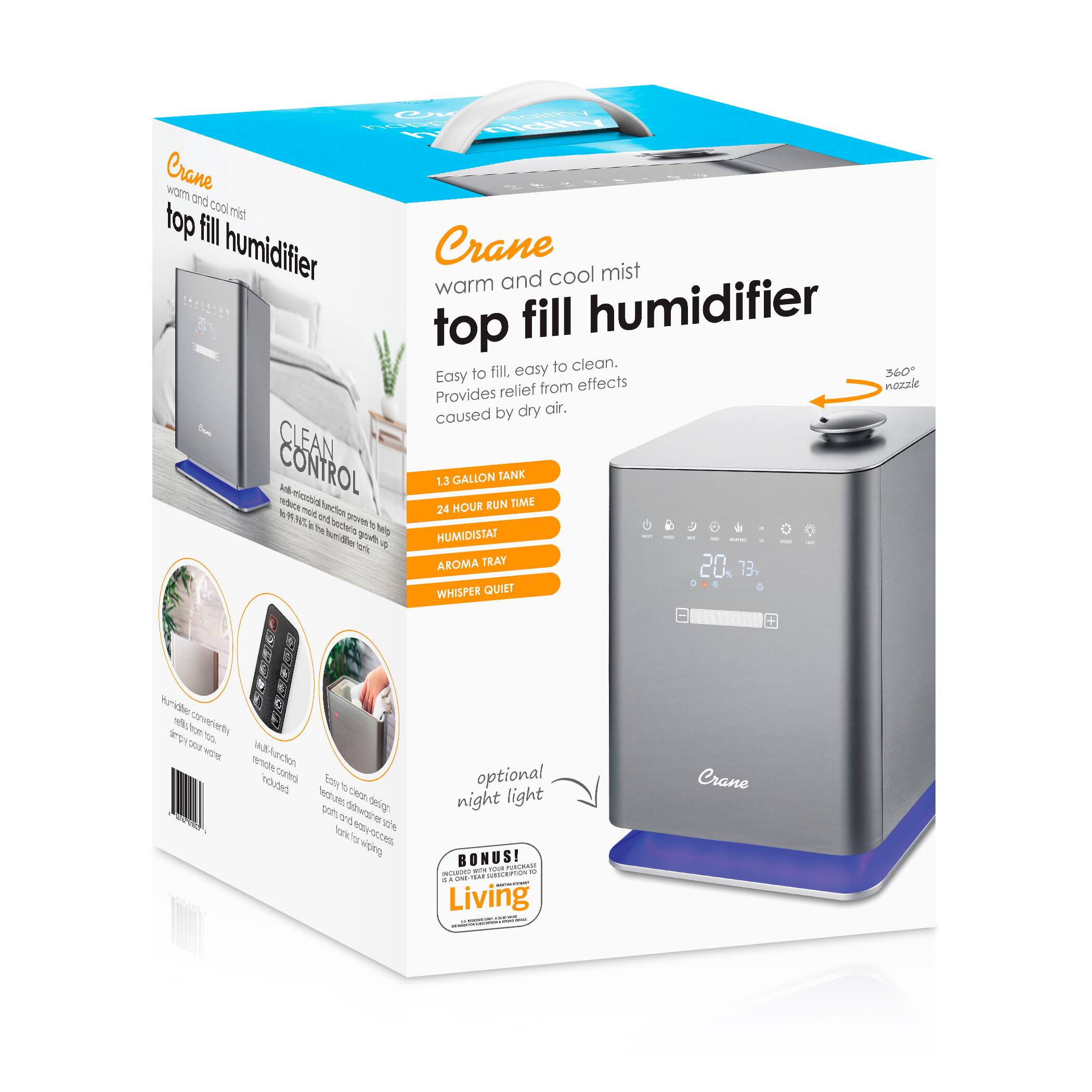 Crane’s easy to clean humidifier design features a detachable bottom fill tank, which is recommended by health professionals for promoting clean humidifier habits, and the water level sensor and cap also are removable, giving you access to clean the entire base