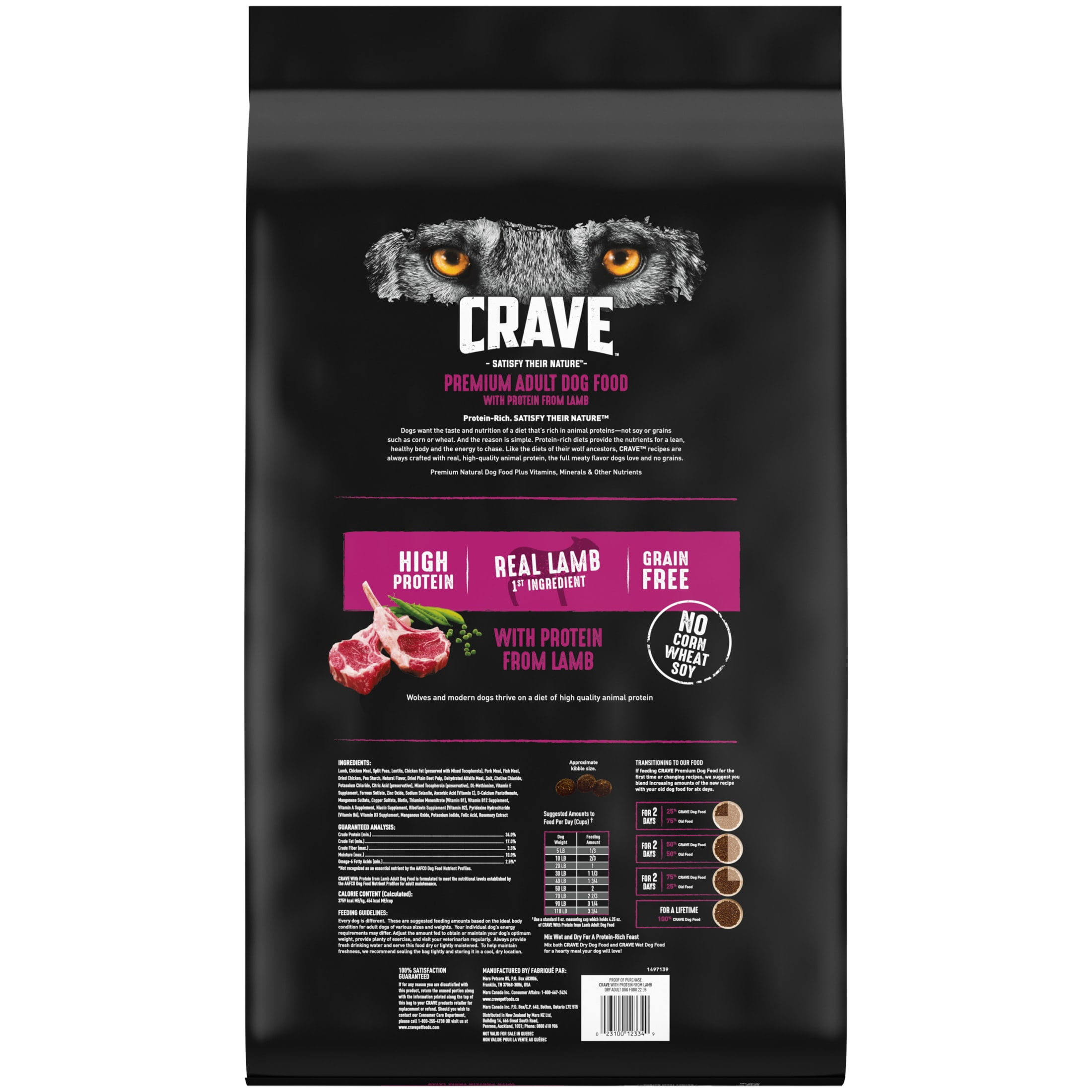 Contains one (1) 22 lb. bag of CRAVE Grain Free Adult Dry Dog Food with Protein from Lamb —for any size dog CRAVE™ recipes are always crafted with real, high-quality animal protein, no grain, and the full meaty flavor that dogs go wild for Made with 34% high protein, to support a strong, lean body Grain free with carbohydrate sources like peas for energy Crafted with quality ingredients: NO chicken by-product meal, NO corn, wheat, or soy protein, and NO artificial flavors, colors, or preservatives Protein-rich recipe complete with the quality nutrients your dog needs