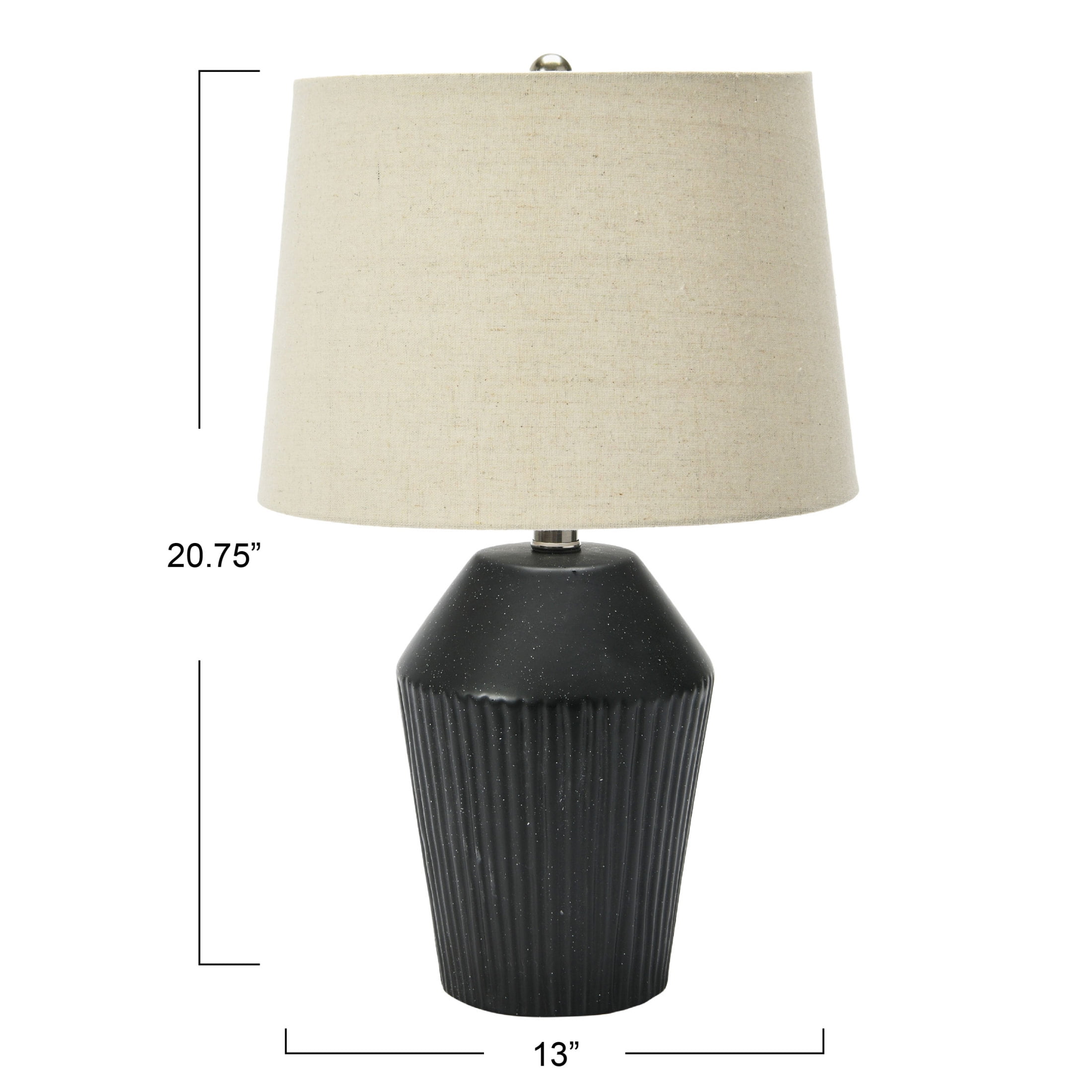 This elegant, vertically embossed stoneware desk lamp features a modern geometric base topped with a linen drum shade Stoneware table lamp with black finish and natural linen drum shade Add a subtle touch of style and sophistication to a home office or living space with this artfully crafted table lamp Maximum 60 watt lightbulb (not included) Lamp measures 20.75″ H x 13″ L x 13″ W; 5′ Cord