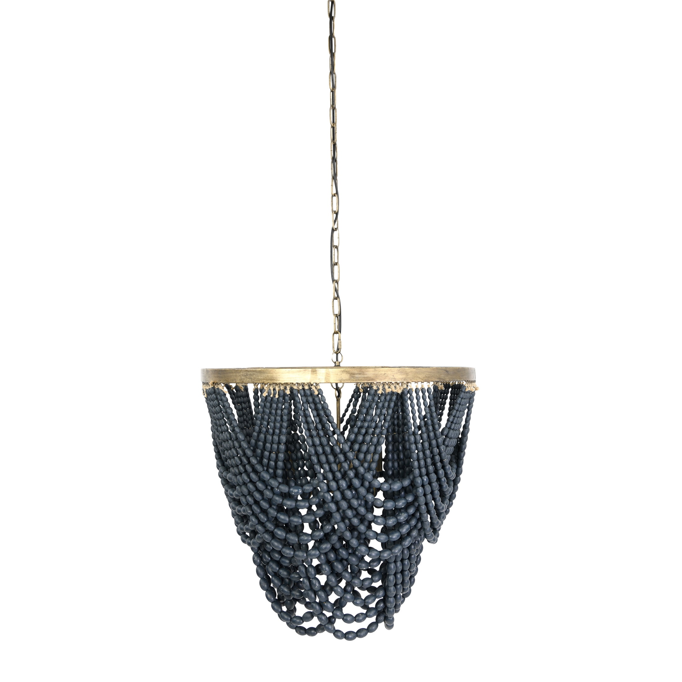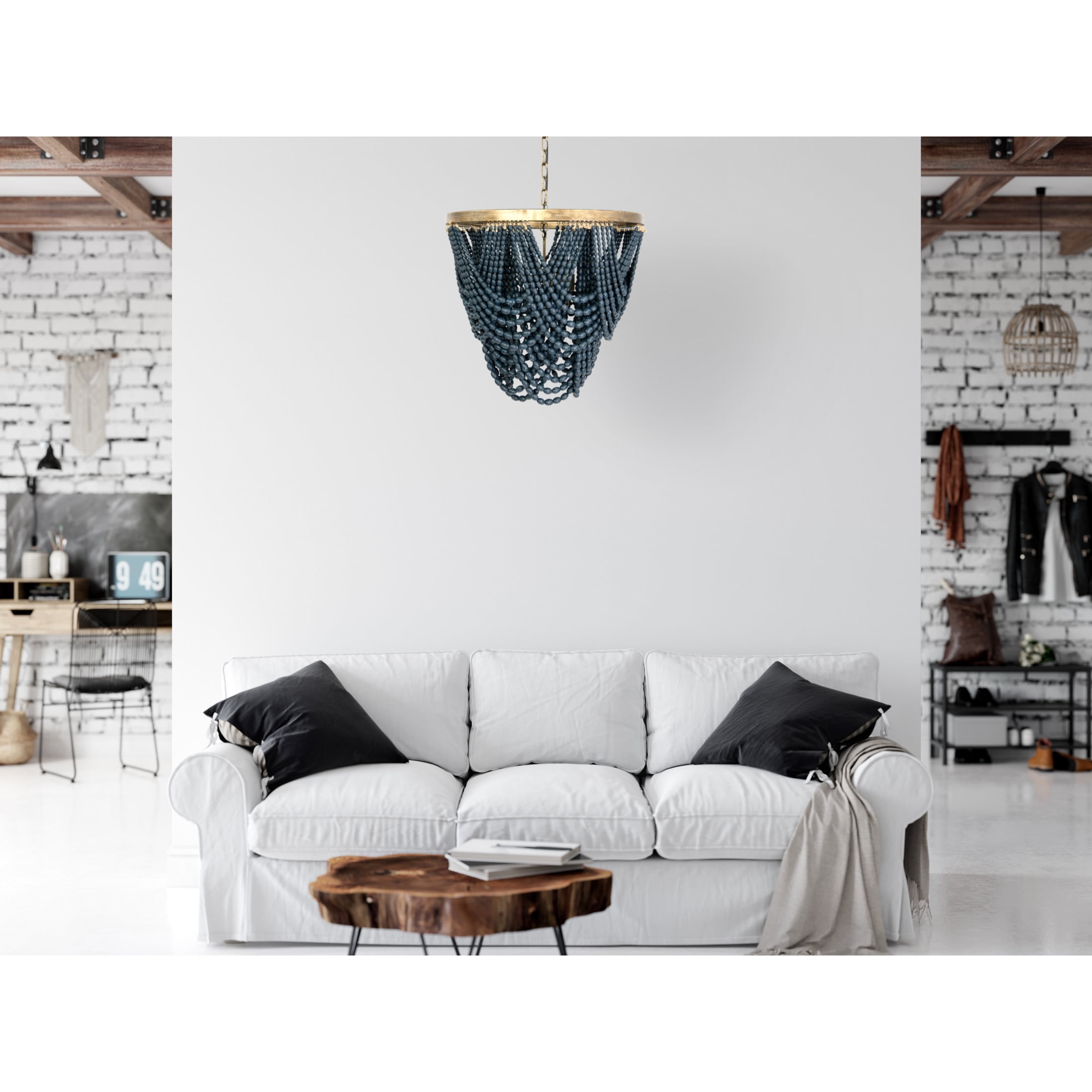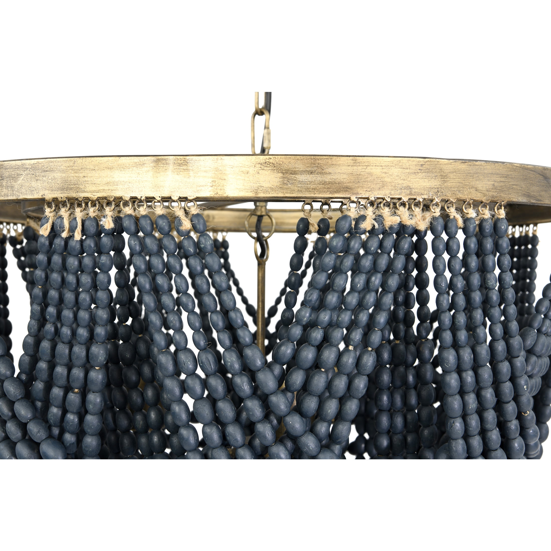 This stunning chandelier style ceiling light showcases delicately draped wood beads strung from a sleek metal frame Brushed gold metal and blue wood bead chandelier with 3 lights, 10′ cord, and 6-10′ chain Wipe clean with dry cloth Hardwiring required; 3 maximum 25W bulbs not included Ceiling light measures 25.5″ L x 25.5″ W x 26″ H
