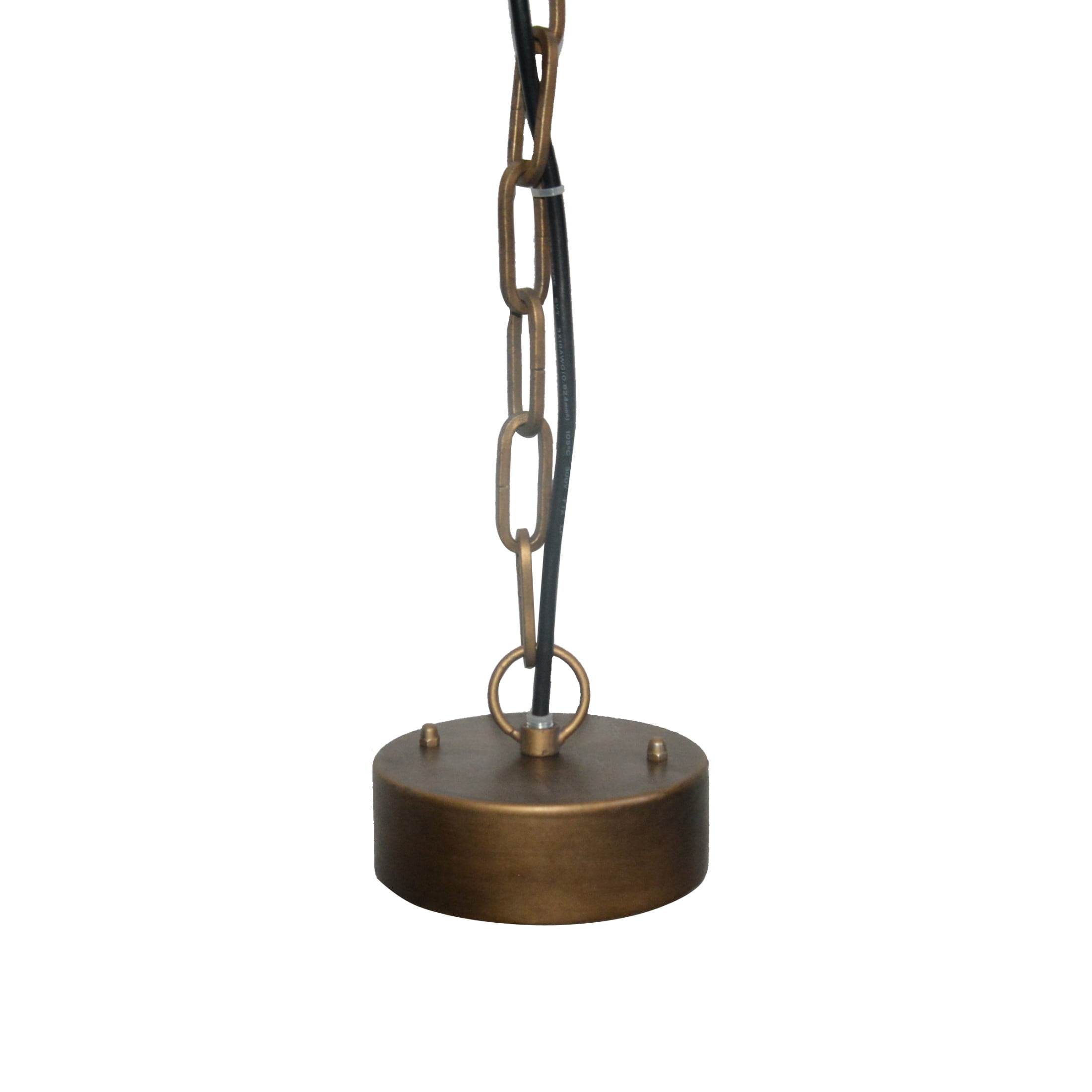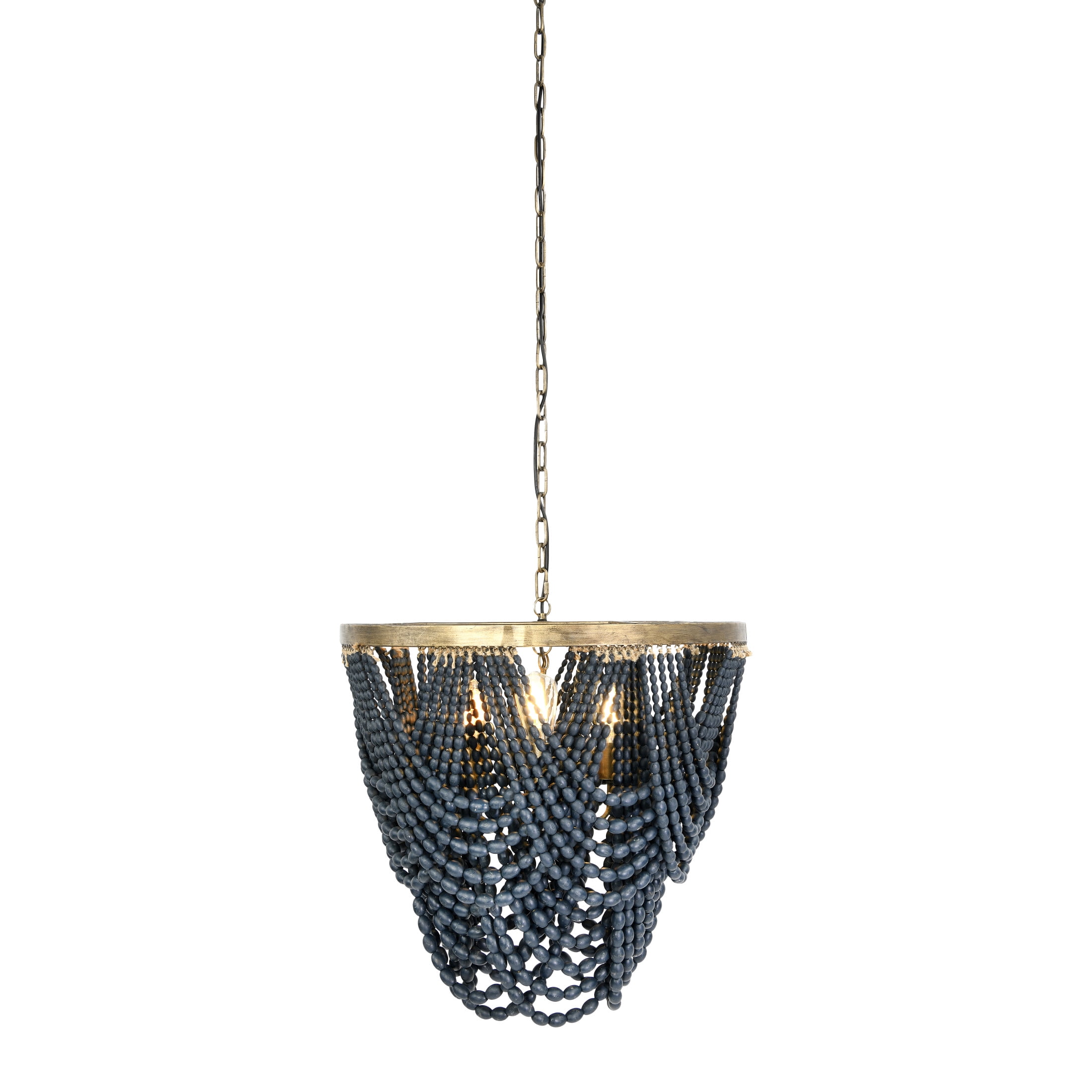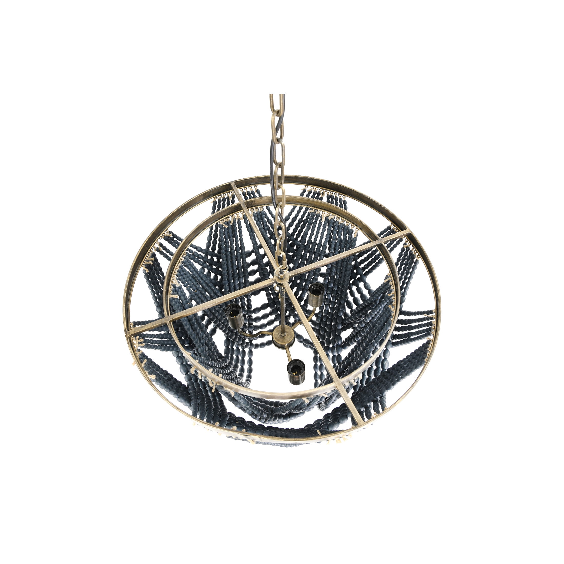 This stunning chandelier style ceiling light showcases delicately draped wood beads strung from a sleek metal frame Brushed gold metal and blue wood bead chandelier with 3 lights, 10′ cord, and 6-10′ chain Wipe clean with dry cloth Hardwiring required; 3 maximum 25W bulbs not included Ceiling light measures 25.5″ L x 25.5″ W x 26″ H