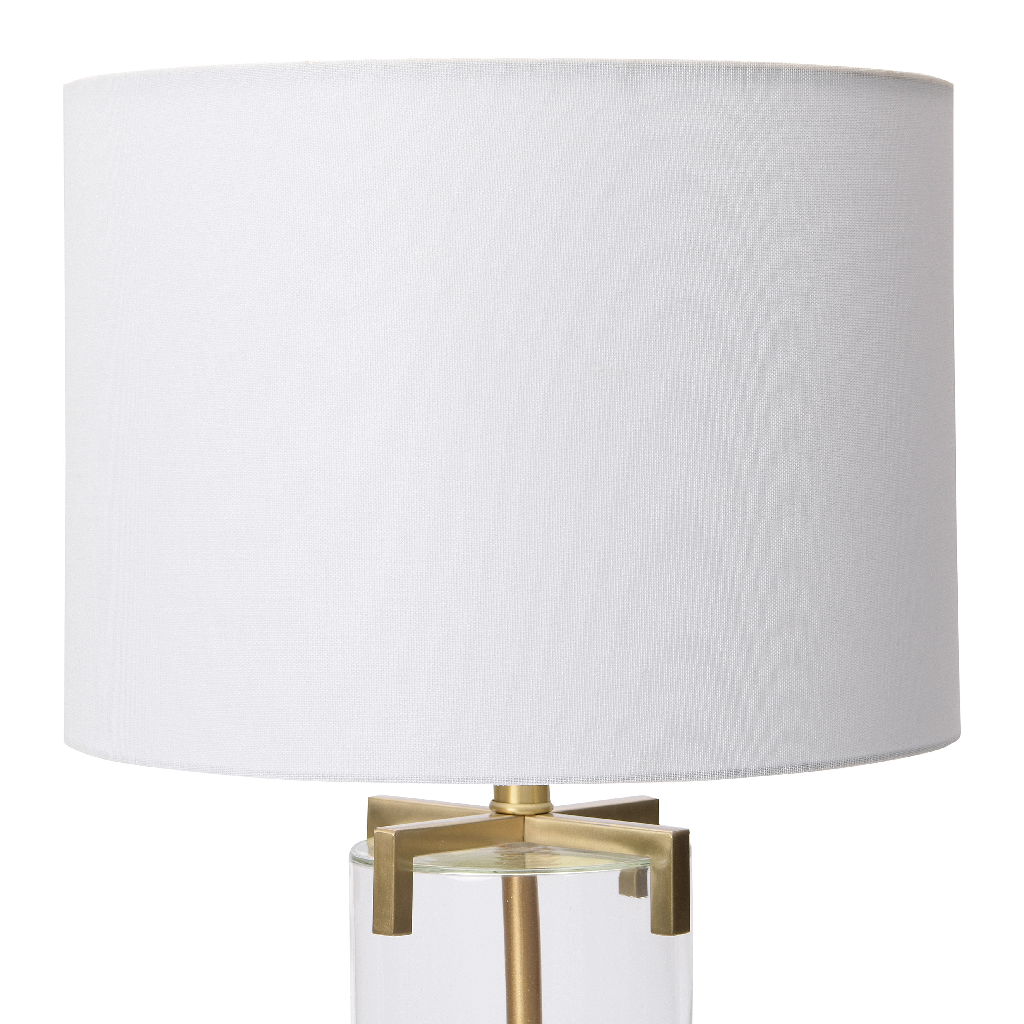 A cylindrical base silhouette provide a modern yet traditional aesthetic. Brushed gold accents add a level of sophistication. Paired with an light cream colored drum shade. Overall height is 26.5″.