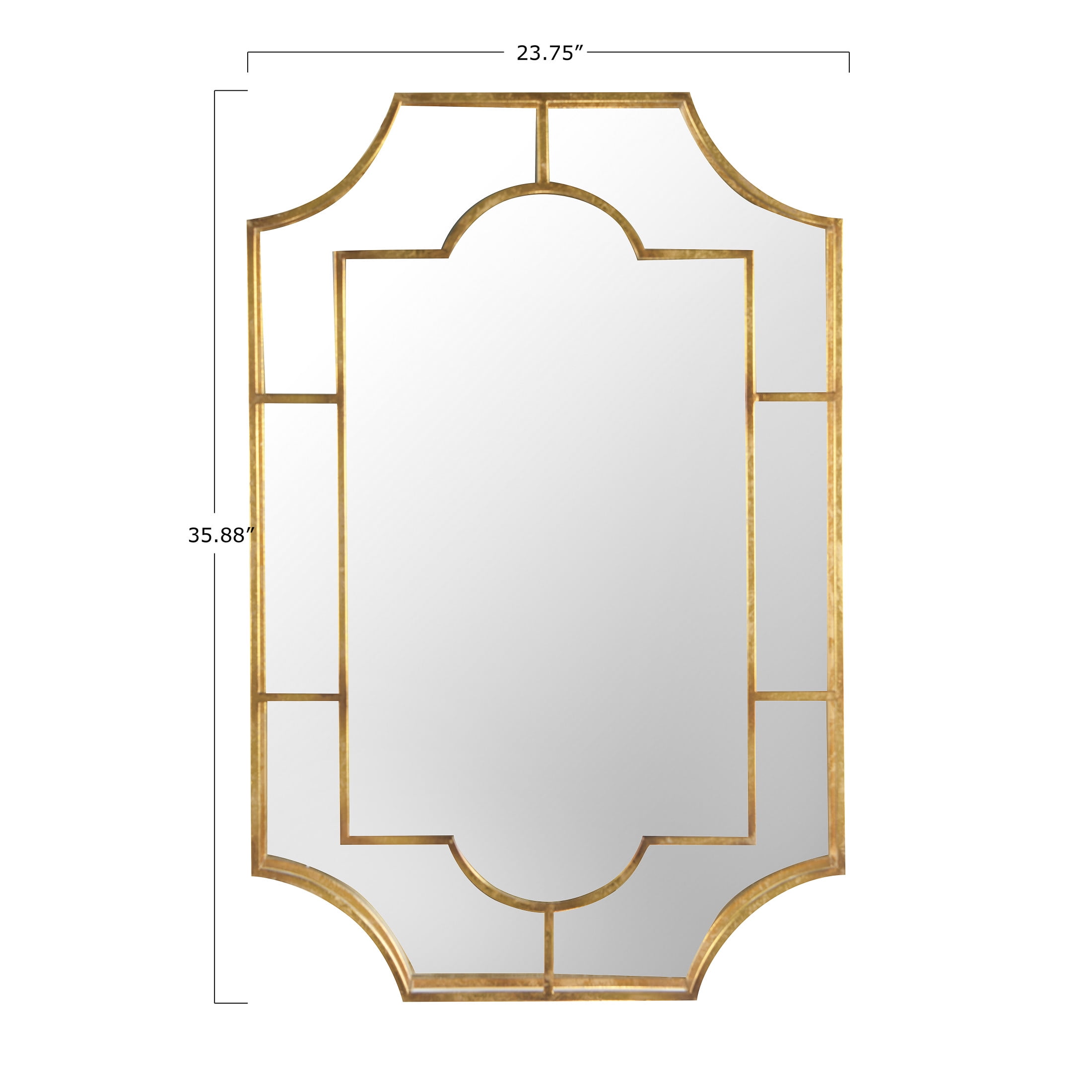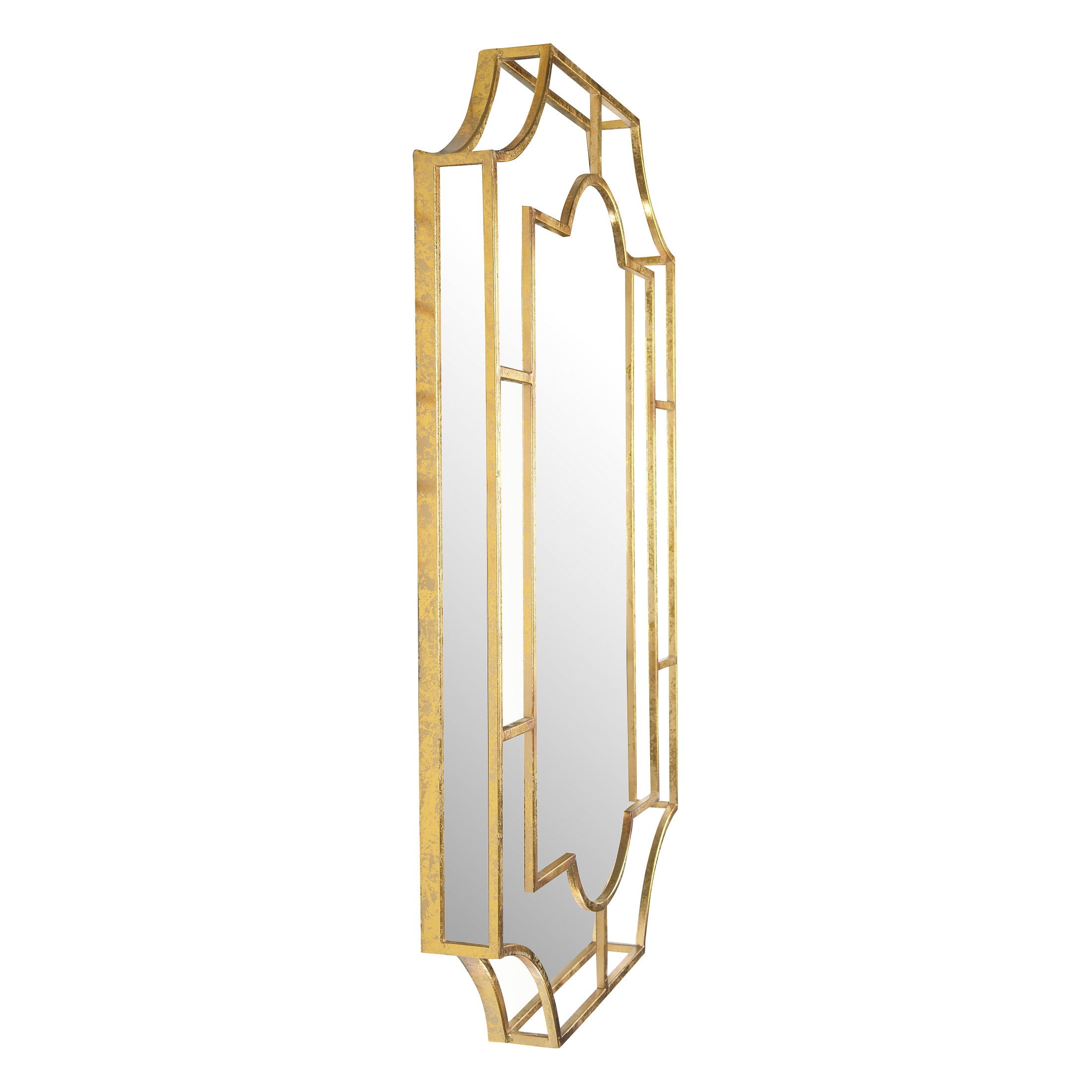 A stunning wall mirror with a unique silhouette and a gilded metal frame in a distressed gold finish Ideal for adding a touch of vintage glamour and sophistication to the living room, bedroom, or hallway Includes hardware for easy mounting, can be hung vertically Made of metal and glass Measures 23.75 inches wide and 36 inches high