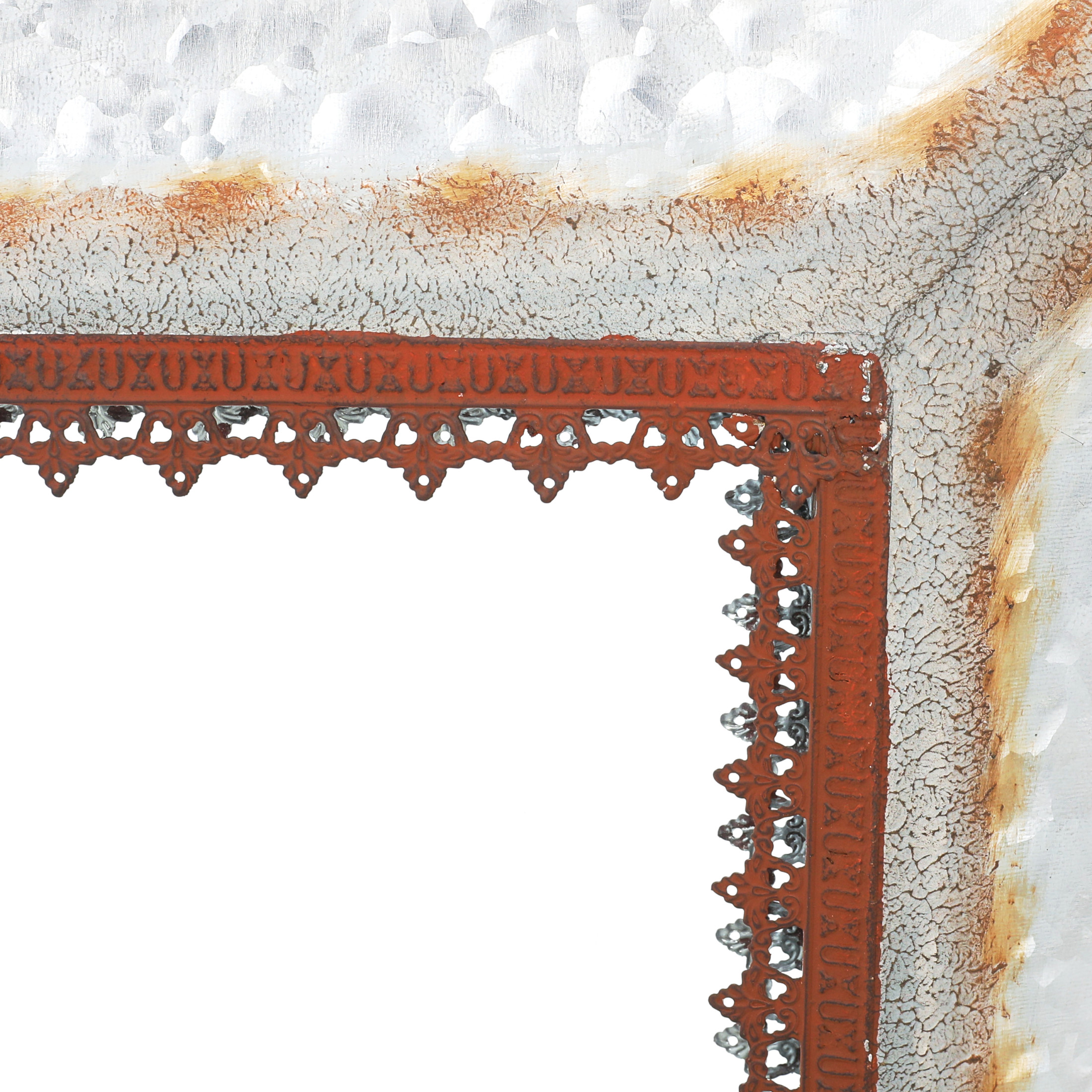 This rustic wall mirror features a distressed metal mirror in a stylishly distressed finish; Made from metal and glass; Mirror measures 30″ L x 2″ W x 30″ H