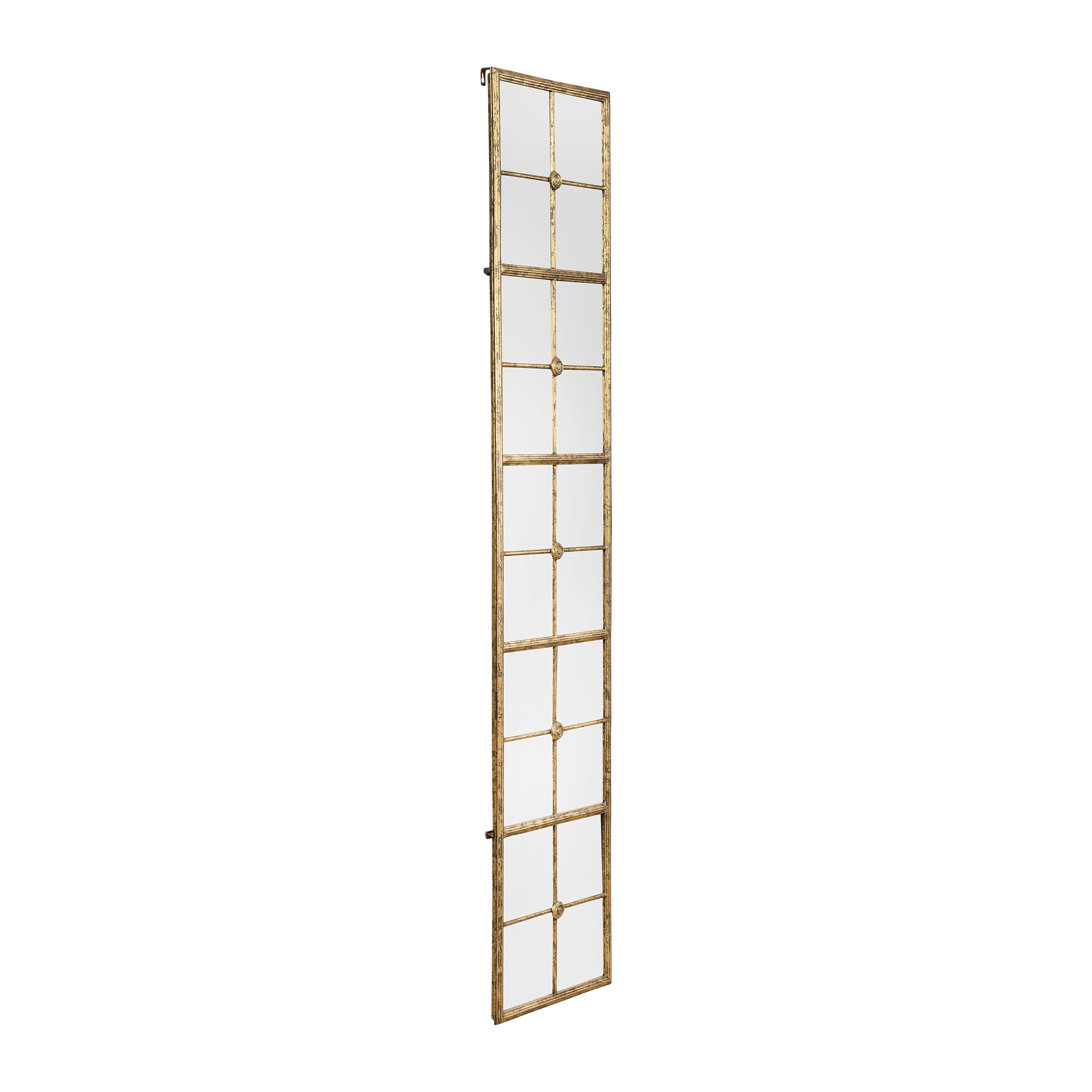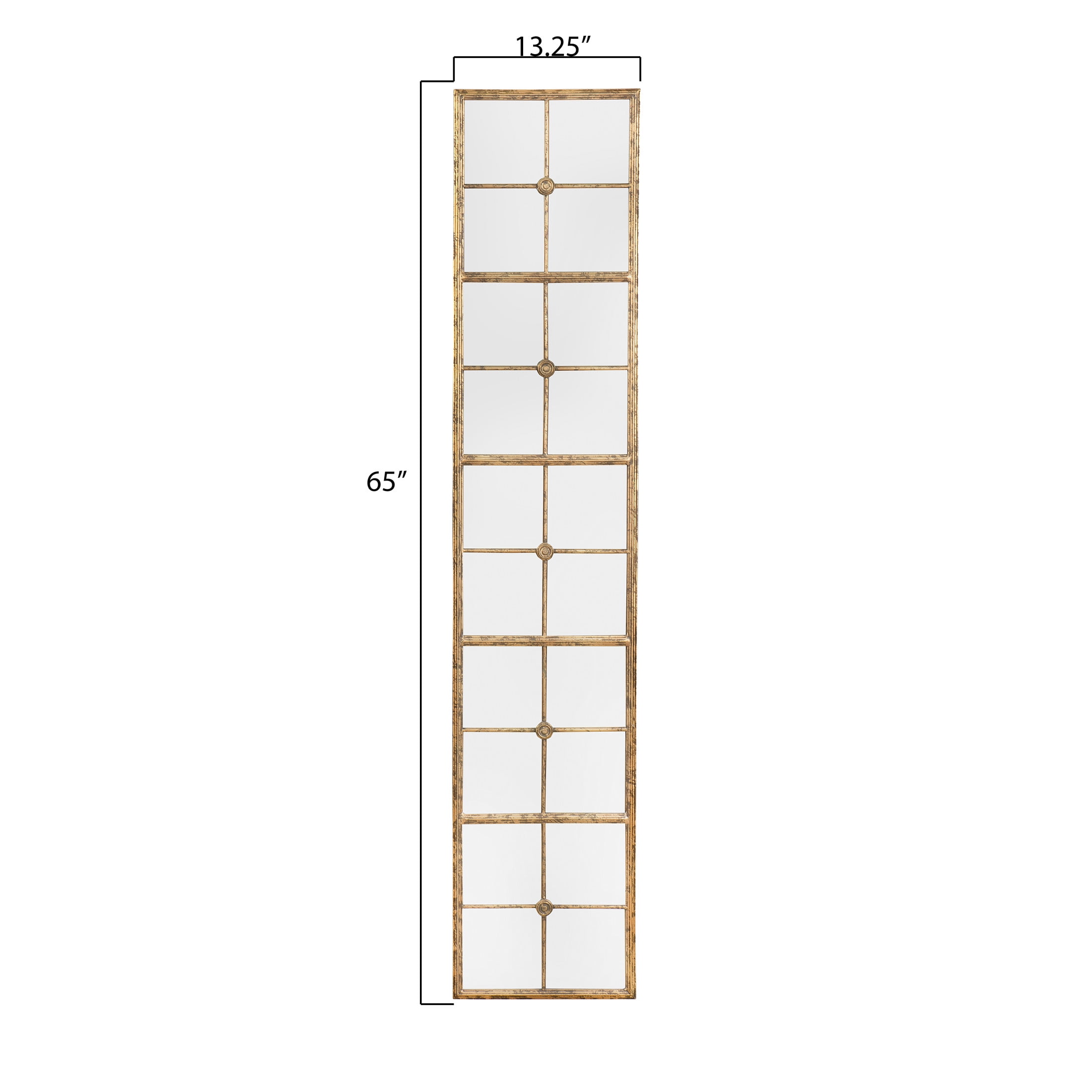 A stunning wall mirror that features a rustic metal frame with stylish windowpane detail in a distressed gold finish Perfect for adding a touch of elegance and sophistication to any living room, bedroom, or hallway Comes with hanging mechanisms for easy installation, can be hung vertically Made of metal and glass Measures 13.5 inches wide and 65 inches high