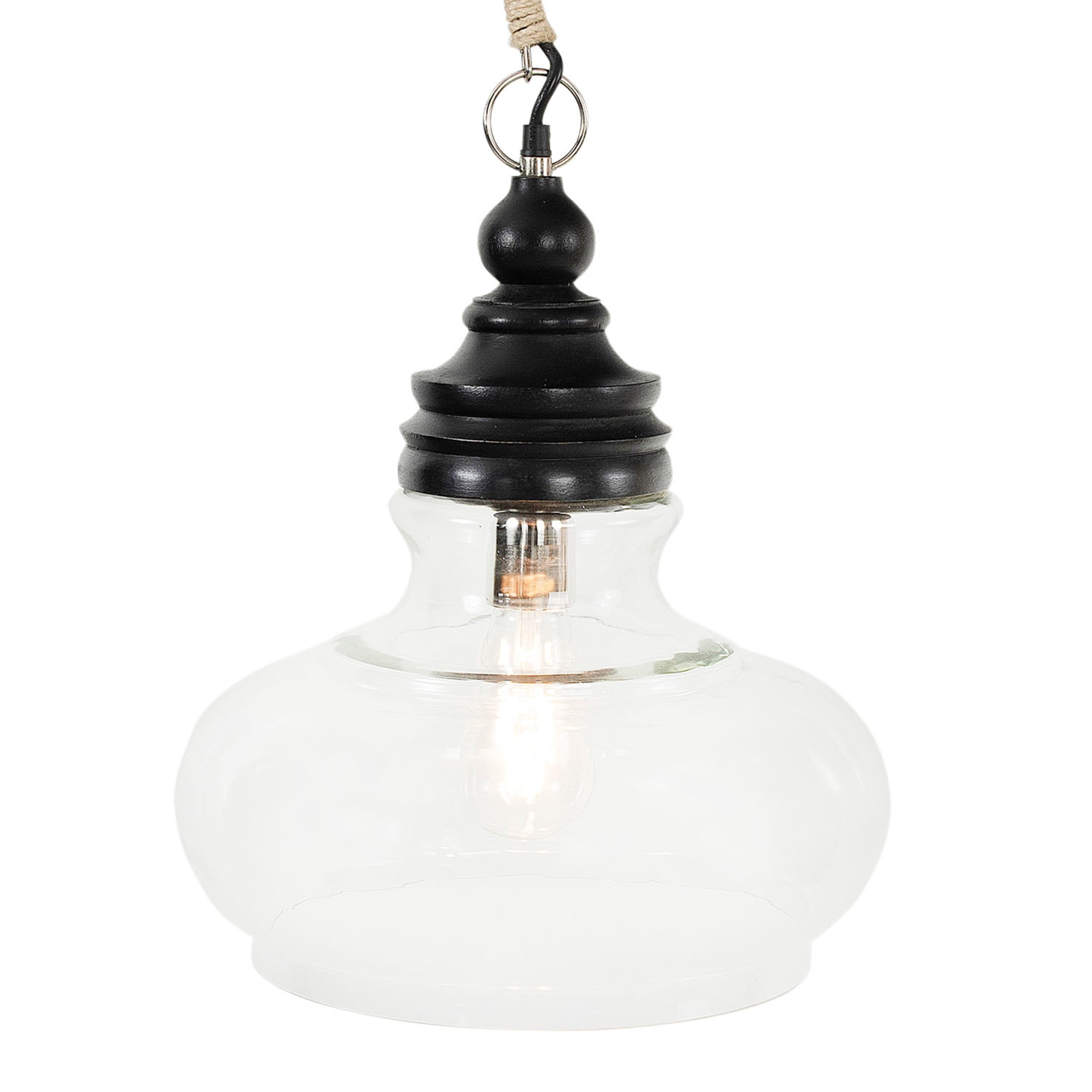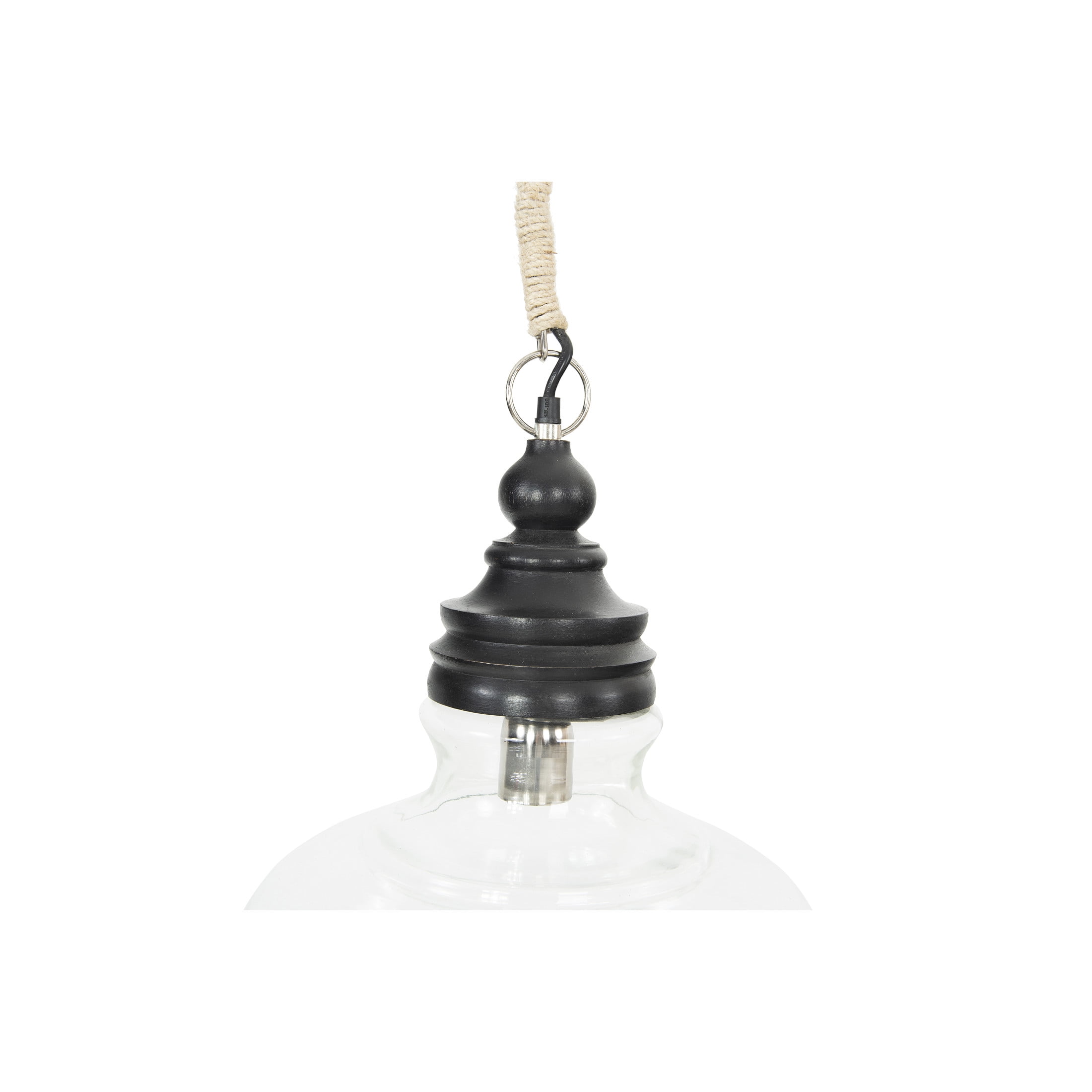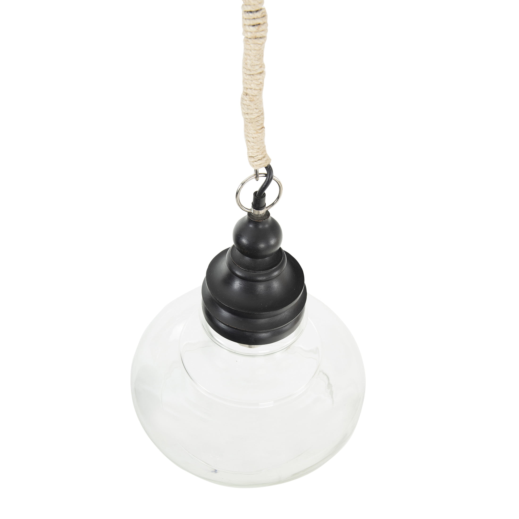 This stylishly versatile ceiling light showcases a sleek glass shade suspended from a distressed wood canopy and jute-wrapped cord Glass and distressed black wood ceiling light with 10′ jute-wrapped cord Wipe clean with dry cloth Hardwiring required; Maximum 40W bulb not included Ceiling light measures 13.5″ L x 13.5″ W x 15″ H
