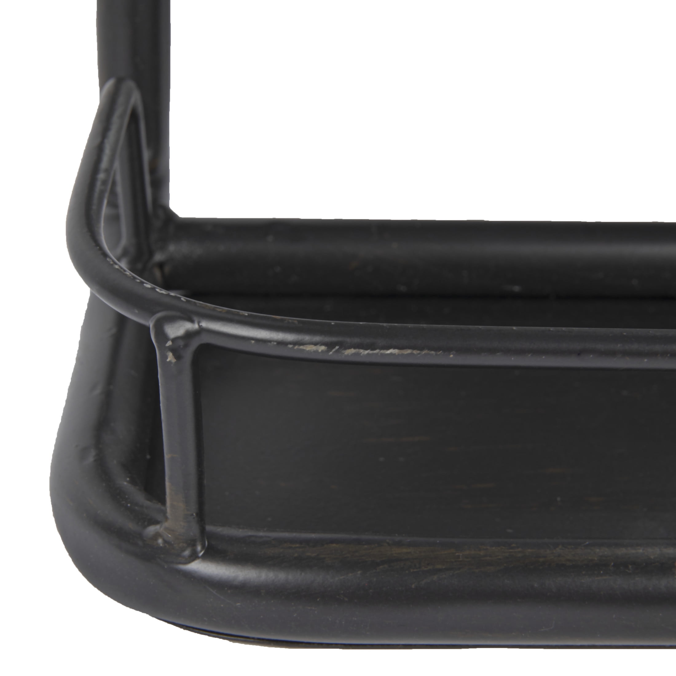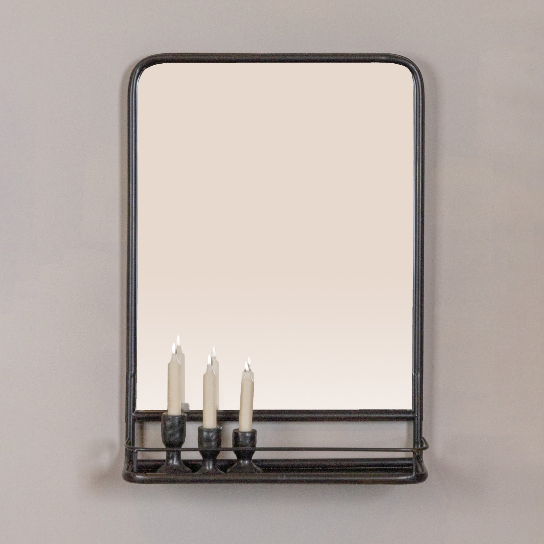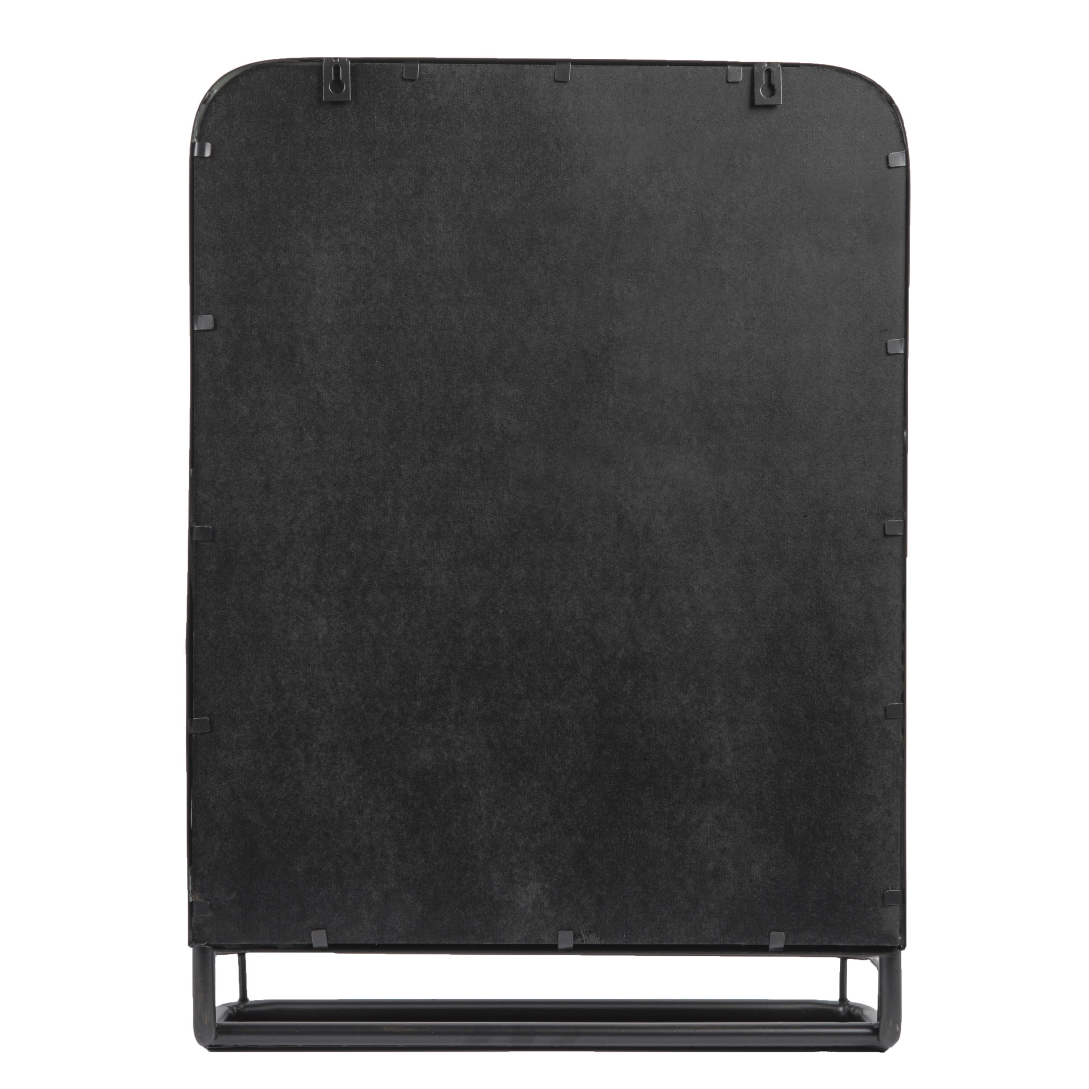 Add functionality and style to the home with this black metal framed rectangle wall mirror with a shelf. This sleek and contemporary wall mirror features a black metal frame with an attached shelf. The black metal frame adds some contrast and elegance to the wall, while the rectangular shape reflects light and opens up the space. The attached shelf adds convenience and storage space for essentials, such as toiletries, cosmetics, or accessories. This wall mirror is ideal for adding functionality and style to any living space, such as a bathroom, bedroom, or entryway. Hang it on its own or as part of a gallery wall. This wall mirror comes with hanging mechanisms for easy installation. It can be hung vertically. This wall mirror is made of metal, glass, and reclaimed wood, making it sturdy and durable. It measures 19.5 inches long and 27.5 inches high, making it a perfect size for any space. This mirror is a stunning piece that will add a touch of sophistication to any home.