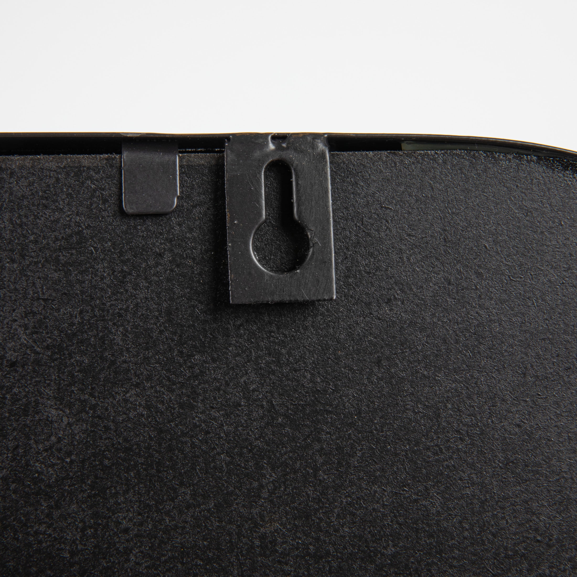A sleek and contemporary wall mirror that features a black metal frame with an attached shelf Ideal for adding some functionality and style to any living space, such as a bathroom, bedroom, or entryway Comes with hanging mechanisms for easy installation, can be hung vertically Made of metal, glass, and reclaimed wood Measures 19.5 inches wide and 27.5 inches high Metal & glass construction