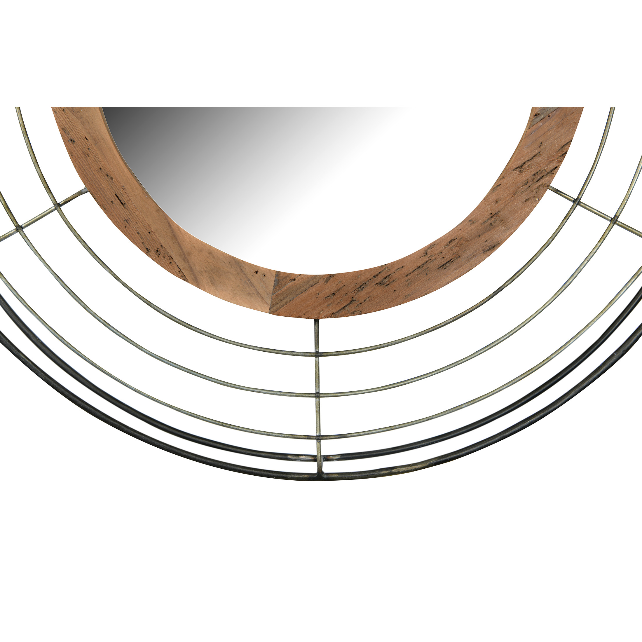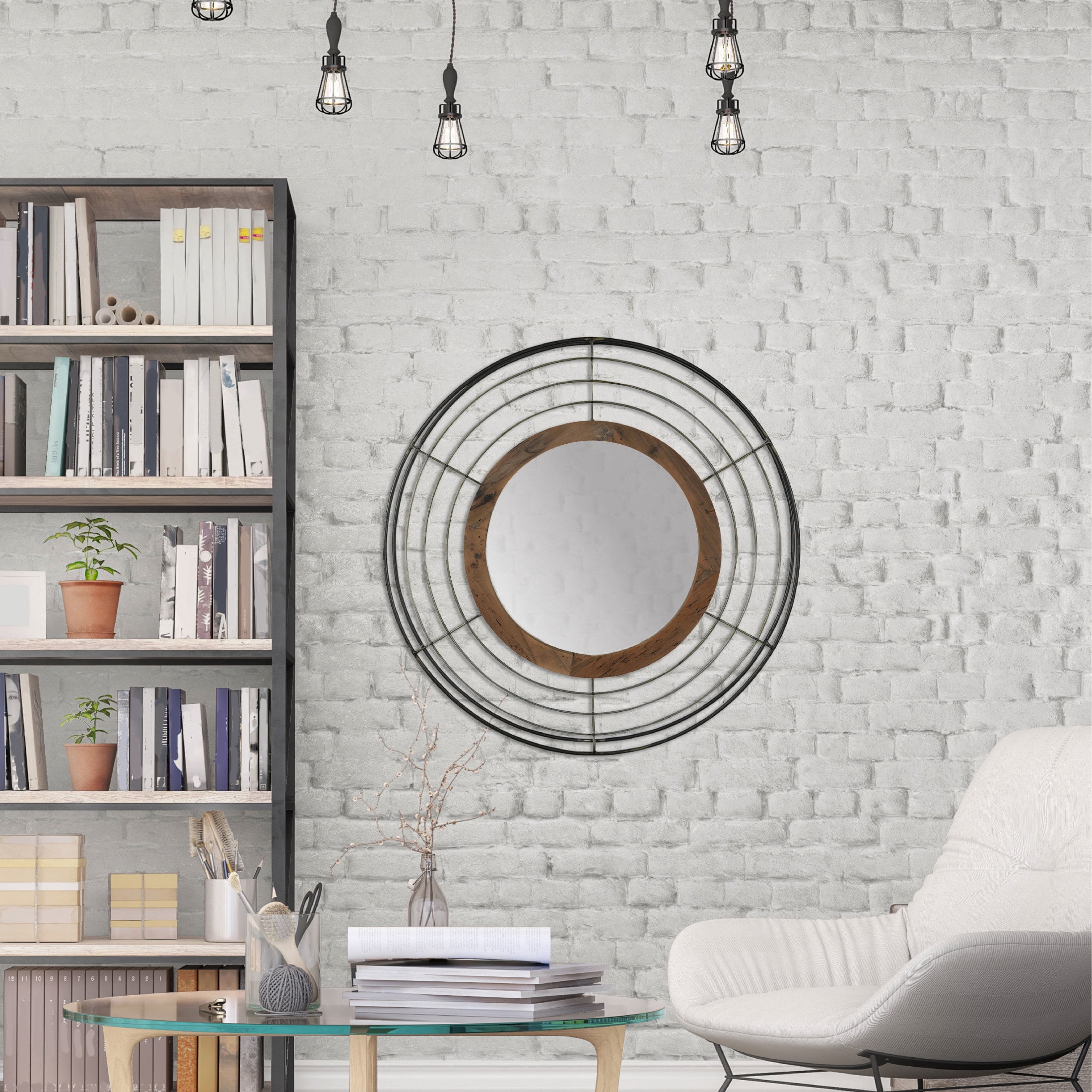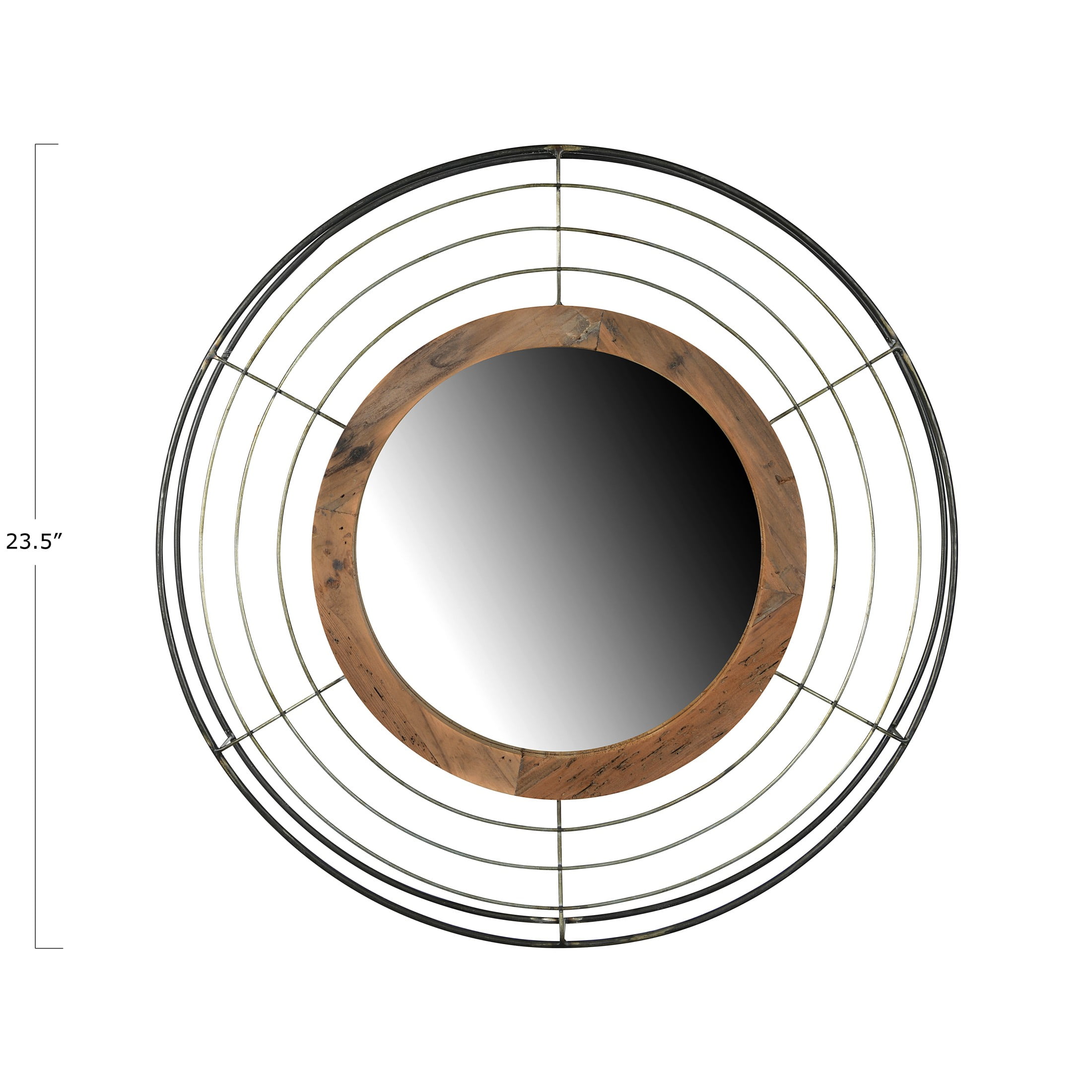 This contemporary wall mirror showcases a sleek wood and wire frame in 2 contrasting hues Round wall mirror with black wire and natural wood frame; Includes keyholes for easy mounting Add style and depth to any living space with this artfully crafted mirror Made from glass, iron, and firwood Mirror measures 23.75 inches L x 3.5 inches W x 23.75 inches H