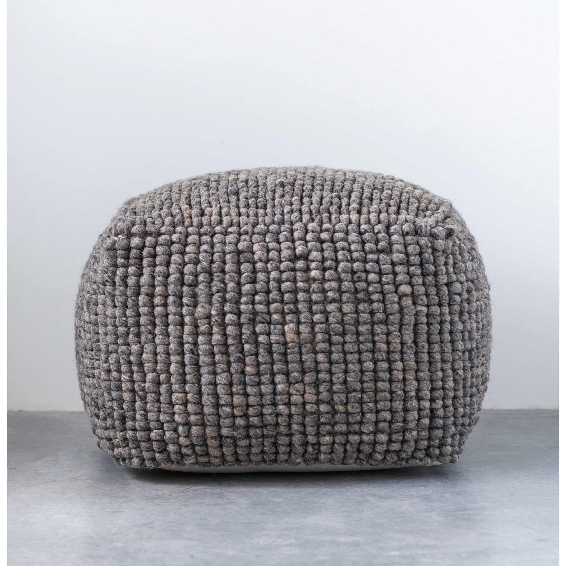 A soft and luxurious New Zealand wool pouf in a classic grey color This pouf would be a great addition to any modern, minimalist, or Scandinavian home décor This pouf is a stylish and functional piece of furniture that can be used in a variety of ways and is easy to care for This pouf is a ready-to-use piece of furniture that is made of high-quality materials and is filled with comfortable beads With a 34-inch length, a 34-inch width, and an 18-inch height, the item is spacious and elegant