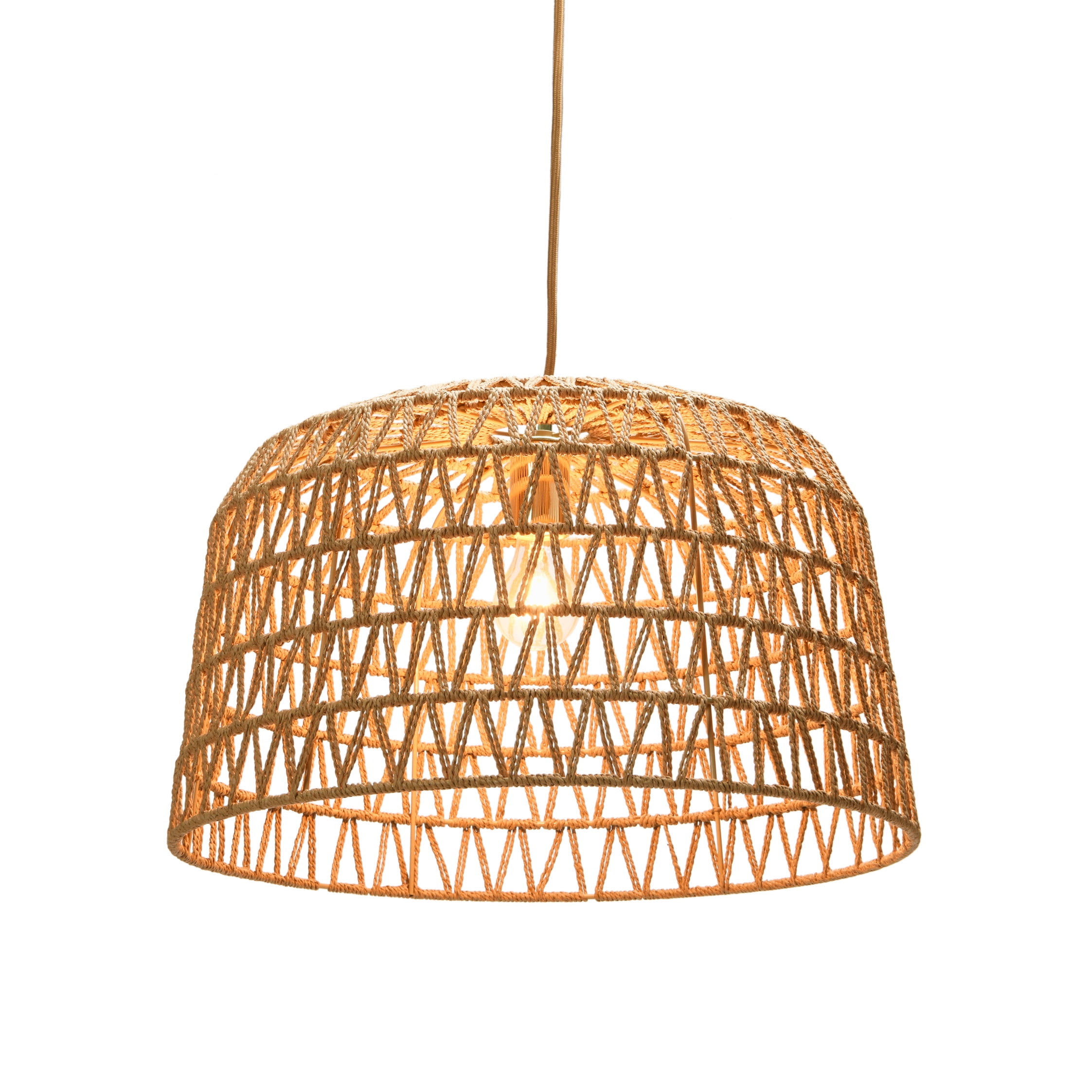 This modern boho ceiling light showcases a woven paper rope shade hung from a brushed gold metal canopy Brushed gold metal and natural woven paper rope pendant light with 10′ cord Wipe clean with dry cloth Hardwiring required; Maximum 40W bulb not included Ceiling light measures 19.5 inches Round x 11.75 inches H