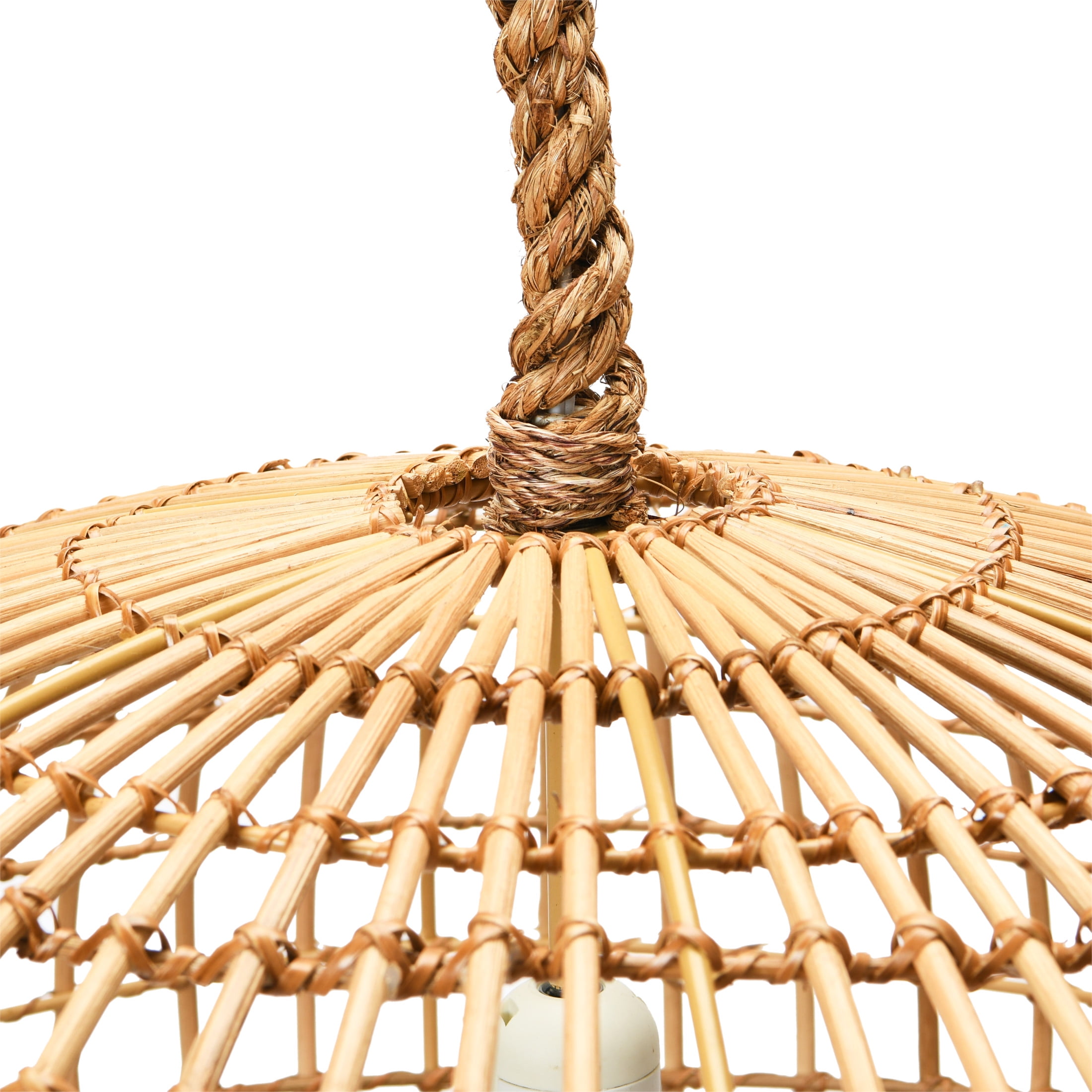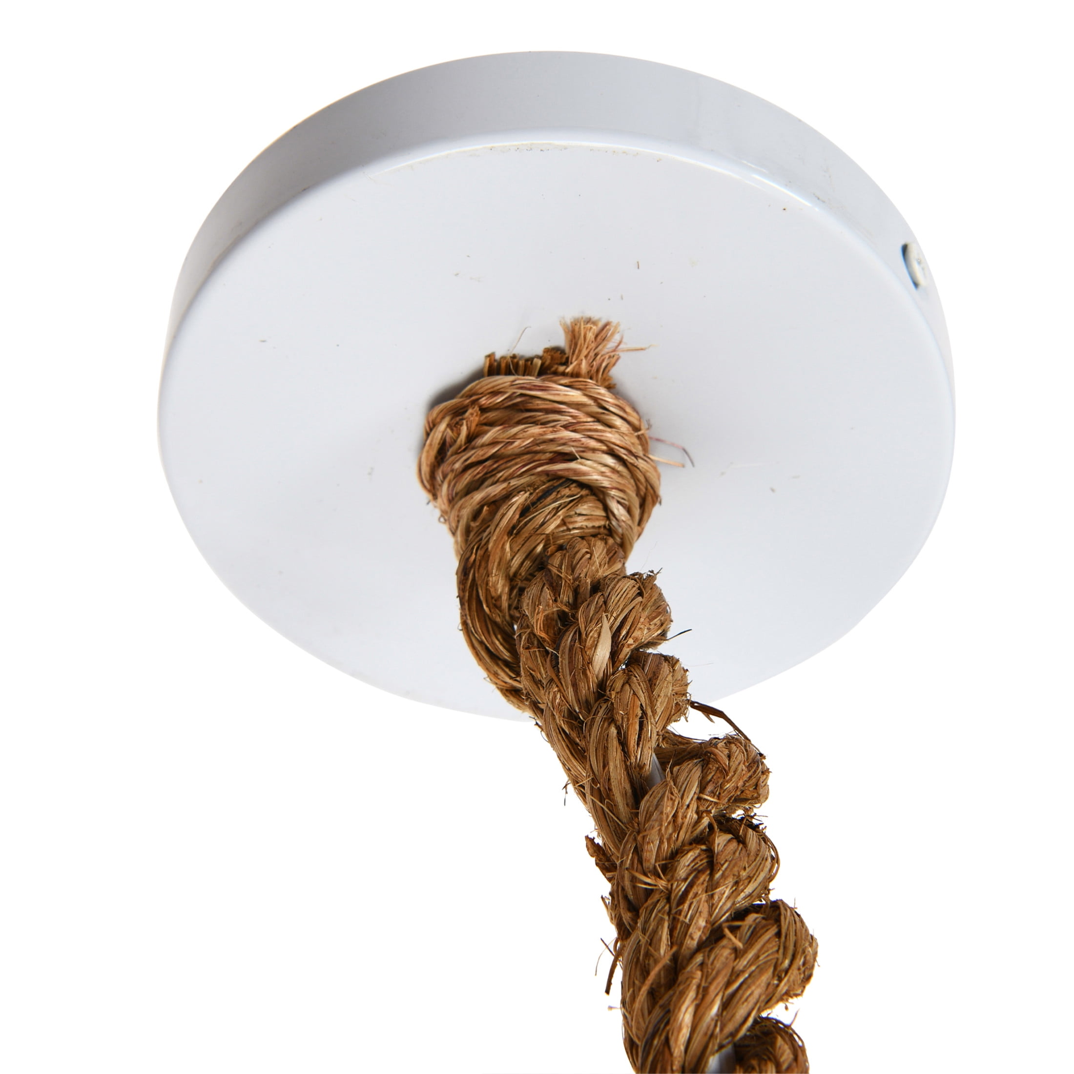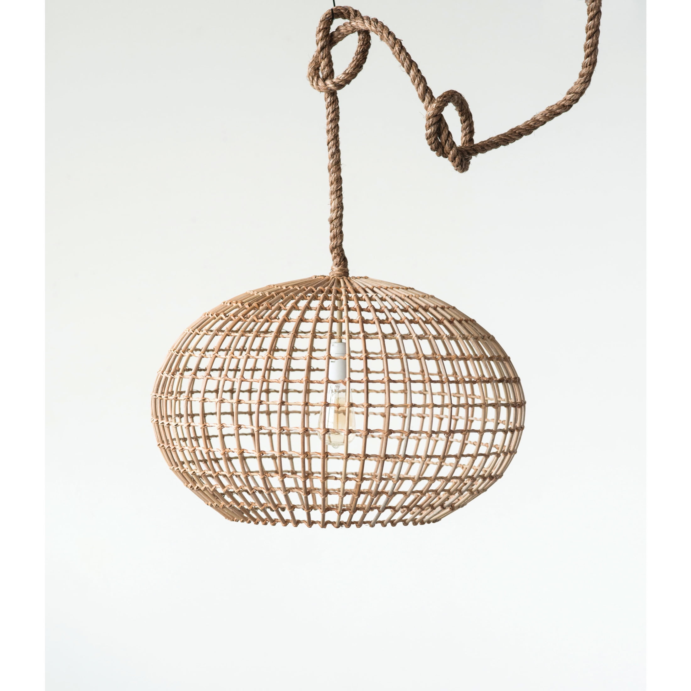 A boho ceiling light that features a natural woven wicker shade and a rope-wrapped cord Ideal for adding a touch of texture and warmth to any room Requires 1 60-watt bulb (not included); Hardwiring required Made of wicker, rope, and cord 24 inches Round x 16 inches Height
