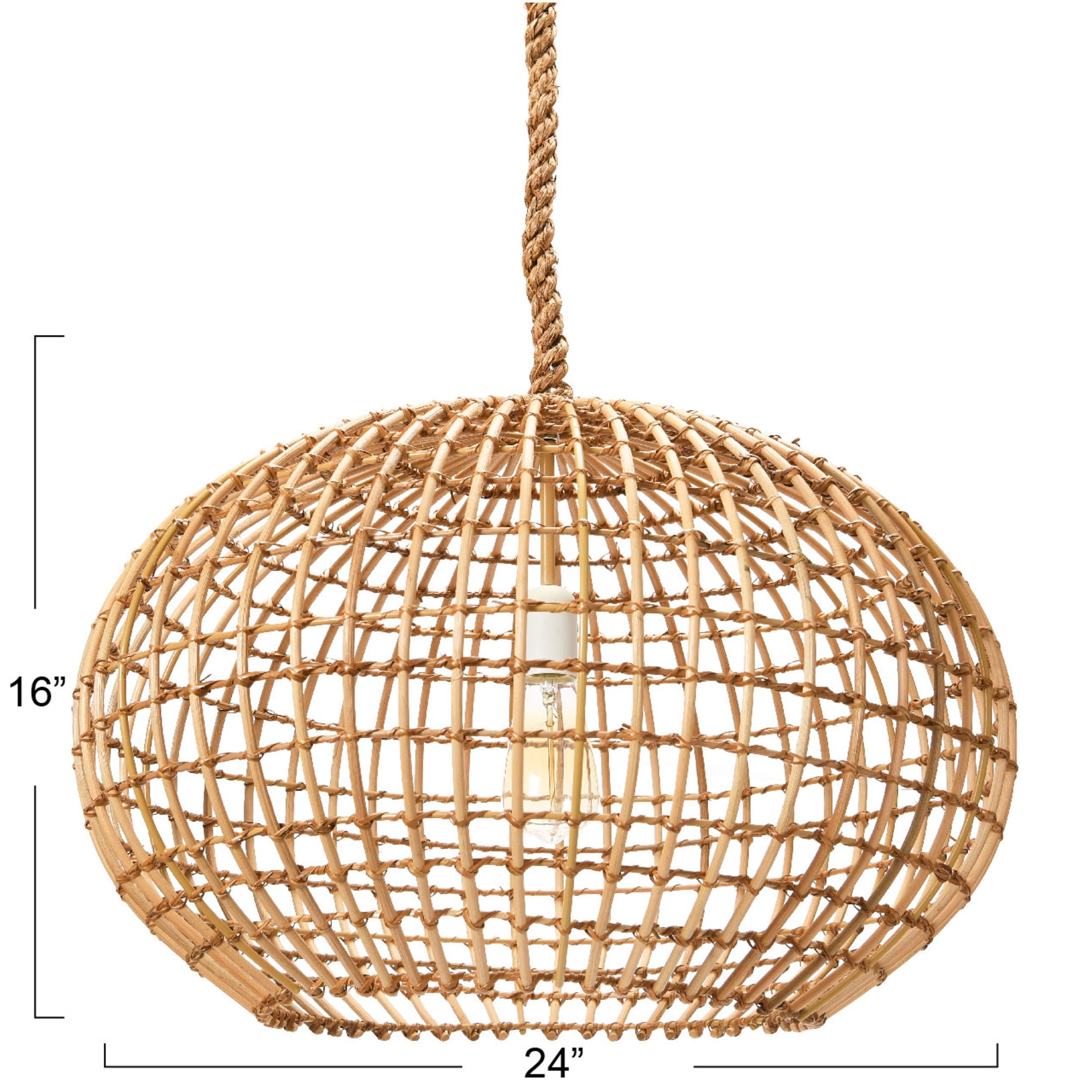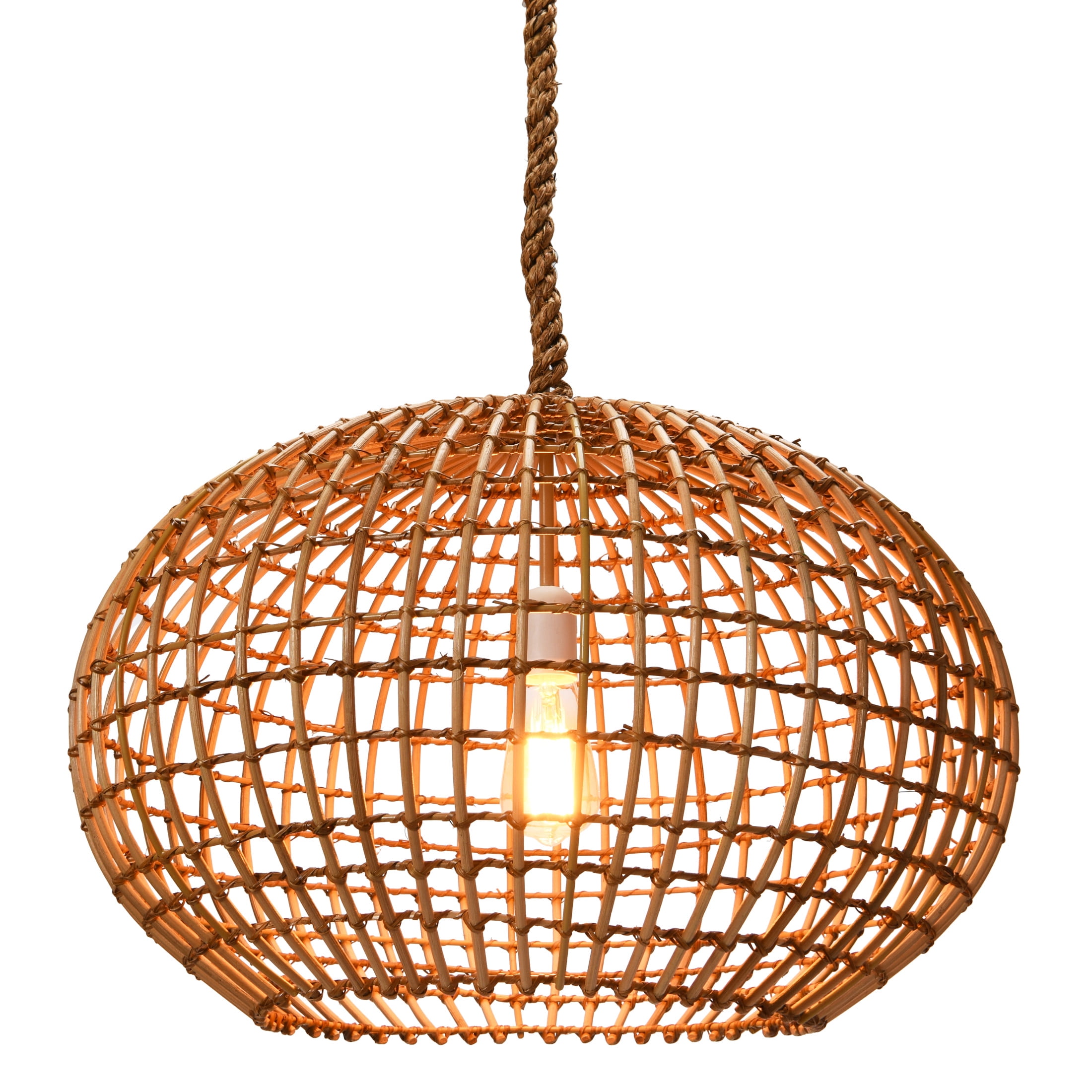 Add some style and charm to the space with this open-weave wicker ceiling light. This ceiling light showcases a natural woven wicker shade that hangs from a tonal rope-wrapped cord. The wicker shade allows the light to shine through and create a cozy and inviting atmosphere. The rope cord adds a touch of rustic flair and durability to the ceiling light. This ceiling light is suitable for enhancing any style of home décor, from bohemian to coastal. Use it in the living room, dining room, bedroom, or any other area that needs some extra texture and brightness. This ceiling light requires one 60W bulb (not included) and hardwiring installation. It measures 24 inches round x 16 inches in height, and the cord length is 6 feet. Add this open-weave wicker ceiling light to the home and enjoy its beauty and functionality.