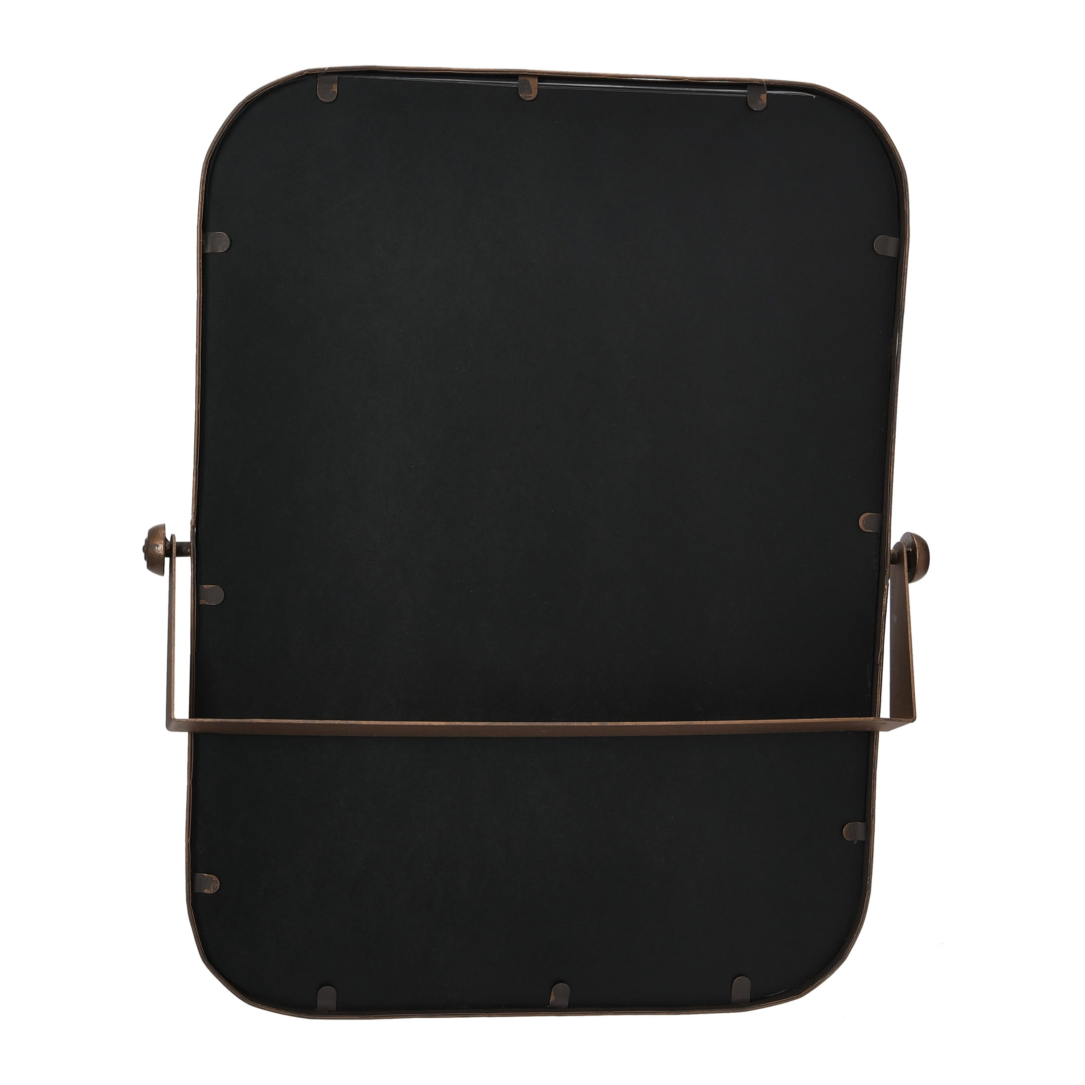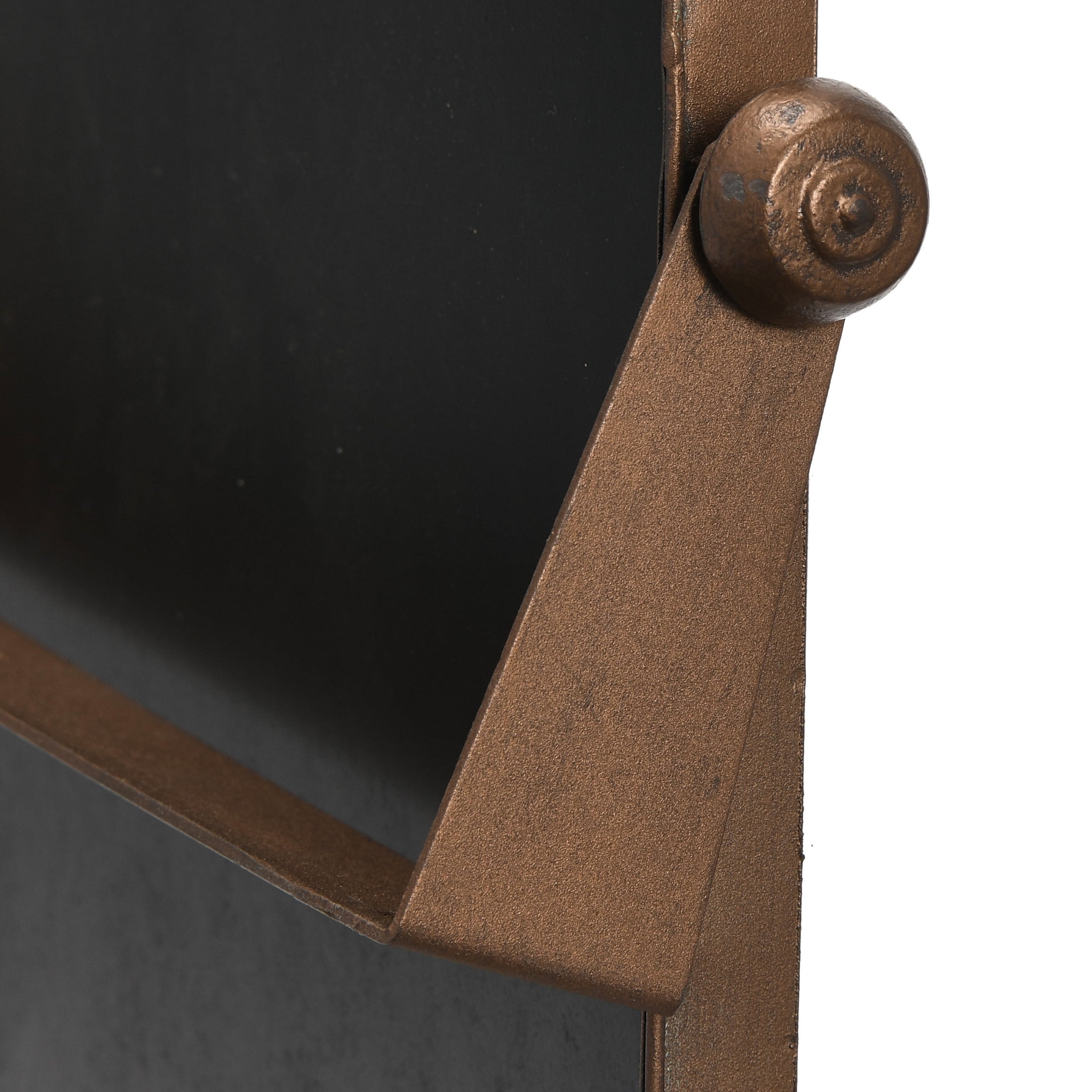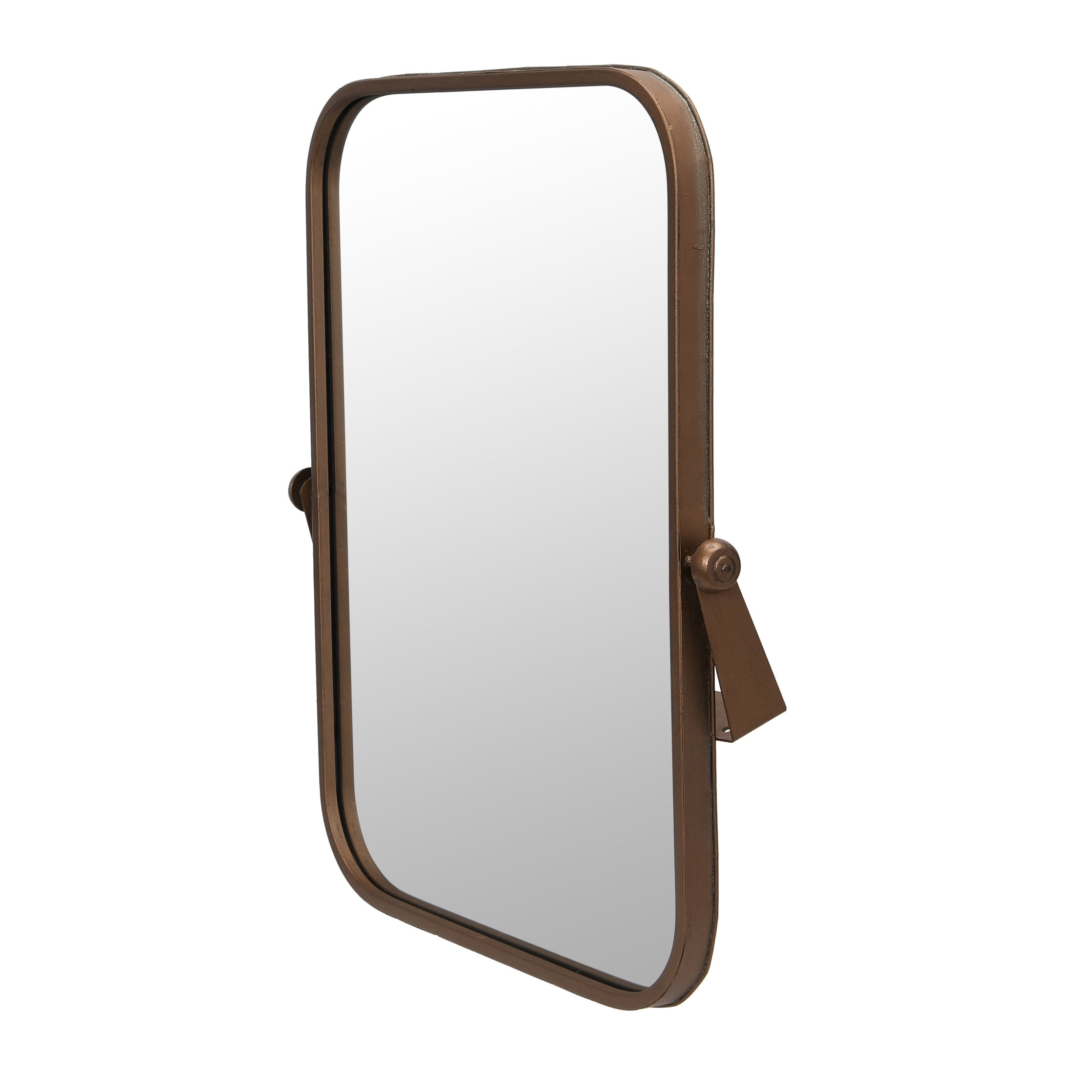 A contemporary and sleek wall mirror that features a copper metal frame with a rounded edge and a pivoting mechanism Ideal for adding some style and functionality to any living space, such as a bathroom, bedroom, or entryway Comes with hanging mechanisms for easy installation, can be hung horizontally or vertically and adjusted with the pivots Made of wood and metal Measures 20.5 inches wide and 24 inches high
