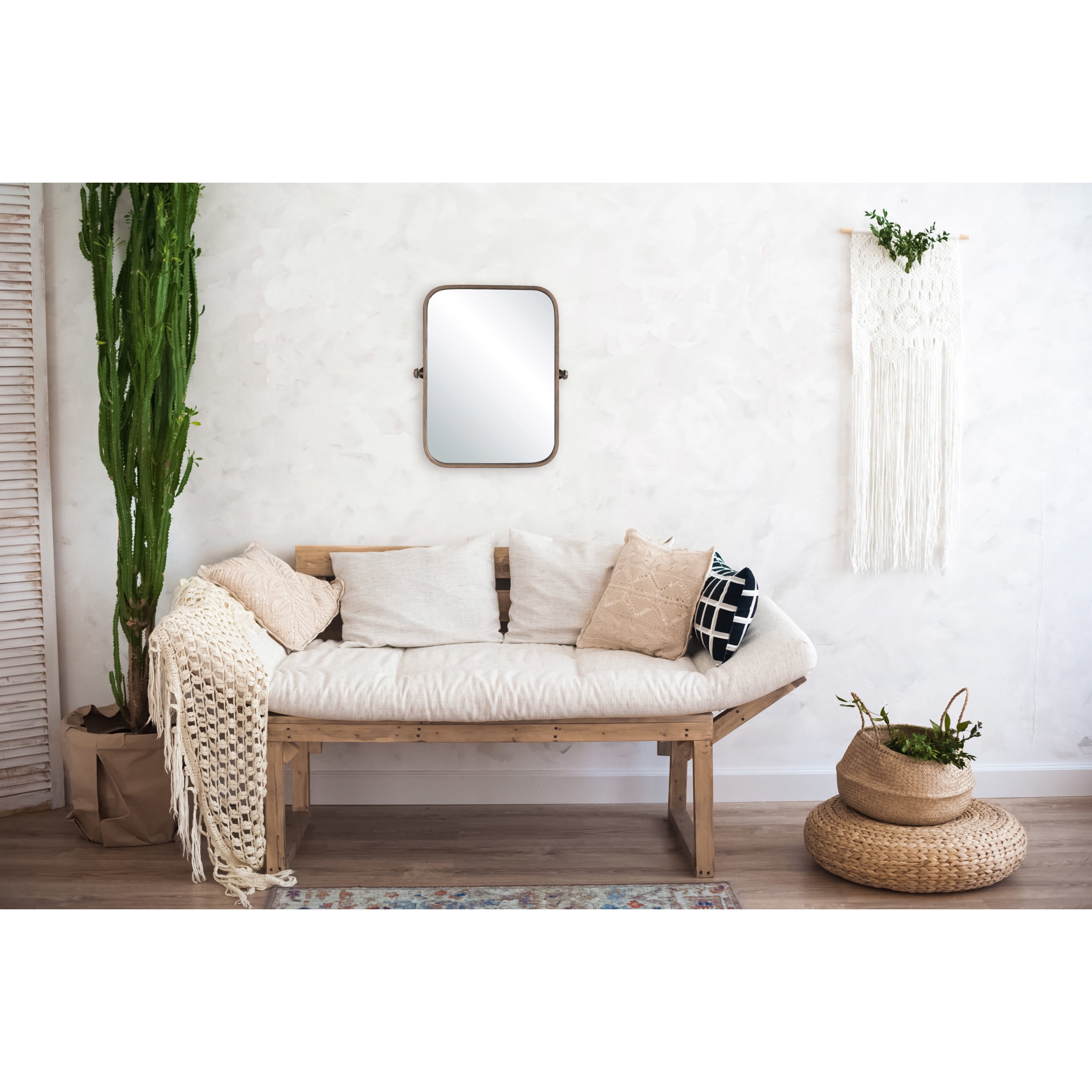 Add style and functionality to the home with this copper framed round edge pivot wall mirror. This wall mirror is a contemporary and sleek piece with a copper metal frame, rounded edge, and pivoting mechanism. The copper metal frame adds some contrast and elegance to the wall, while the rounded edge adds softness and flair. The pivoting mechanism adjusts the angle of the mirror to suit any needs and preferences. This wall mirror is ideal for adding style and functionality to any living space, such as a bathroom, bedroom, or entryway. Hang it on its own or as part of a gallery wall. This wall mirror comes with hanging mechanisms for easy installation. It can be hung horizontally or vertically and adjusted with the pivots. This wall mirror is made of wood and metal, making it sturdy and durable. It measures 20.5 inches wide and 24 inches high, making it a perfect size for any space. This mirror is a stunning piece that will add a touch of sophistication to any home.