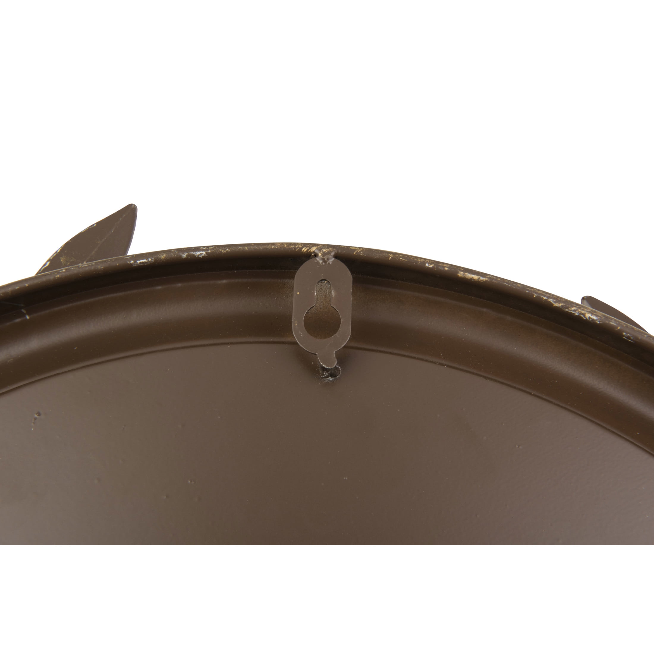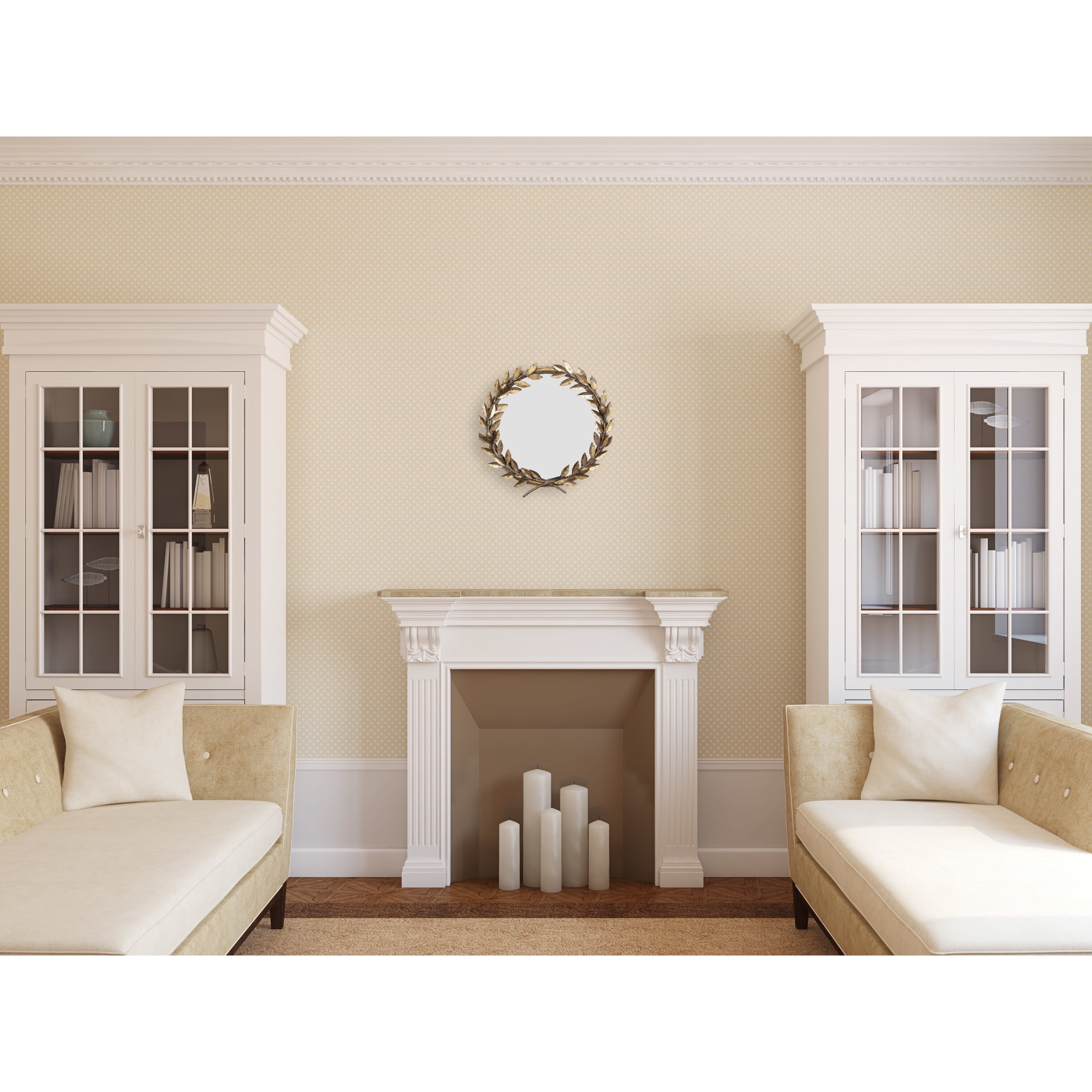 This gold metal laurel wreath round wall mirror adds style and depth to any living space. This artfully crafted mirror features an intricately crafted laurel wreath frame in gilded metal, creating a stunning contrast with the smooth glass. The mirror is made of metal for a durable and shiny look. The mirror has hanging mechanisms for easy installation and can be hung vertically only. This mirror is perfect for adding a touch of elegance and charm to any living room, bedroom, or bathroom. It measures 17.75 inches wide by 18.5 inches high, making it a perfect size for any space. This mirror is a stunning piece that will add a touch of sophistication to any home.