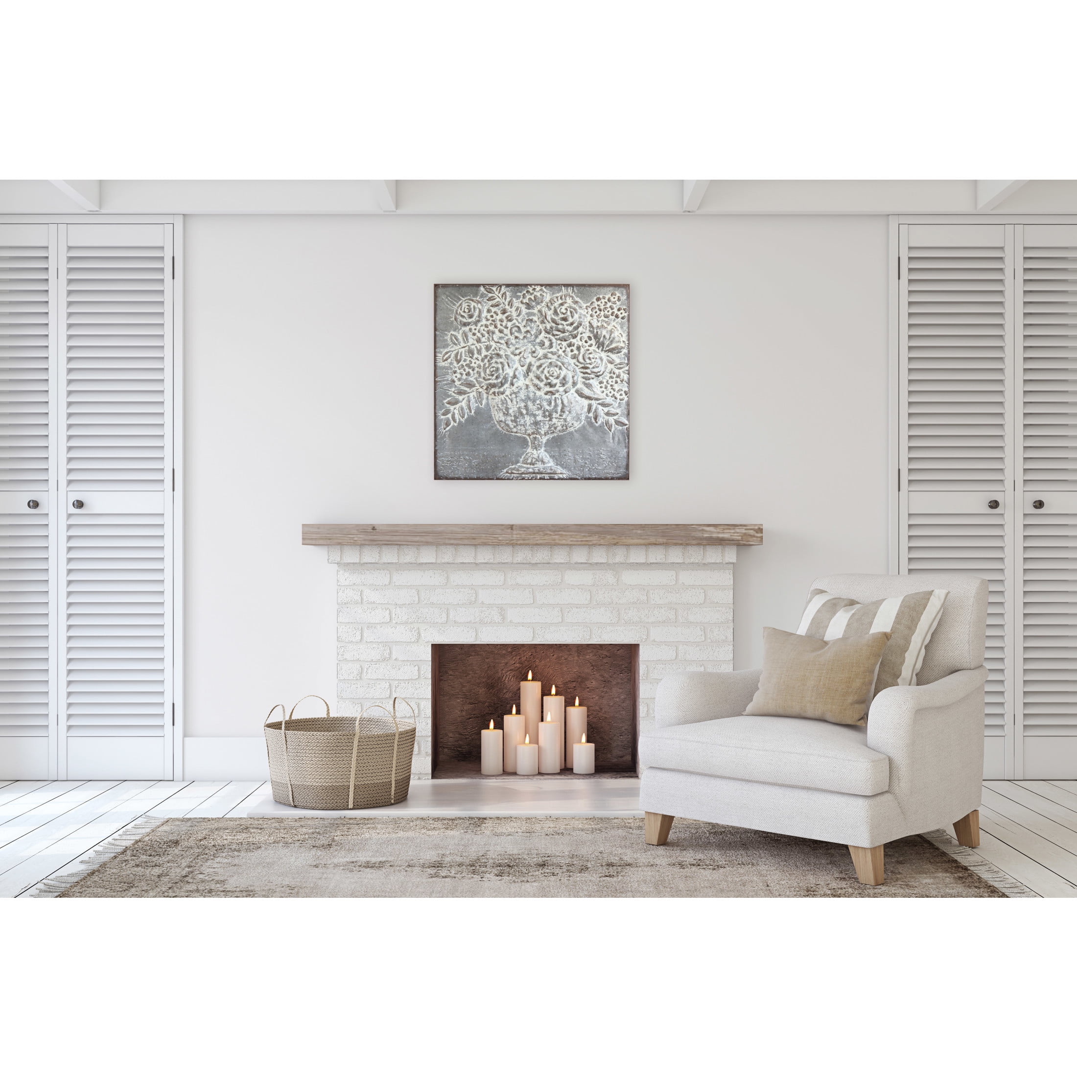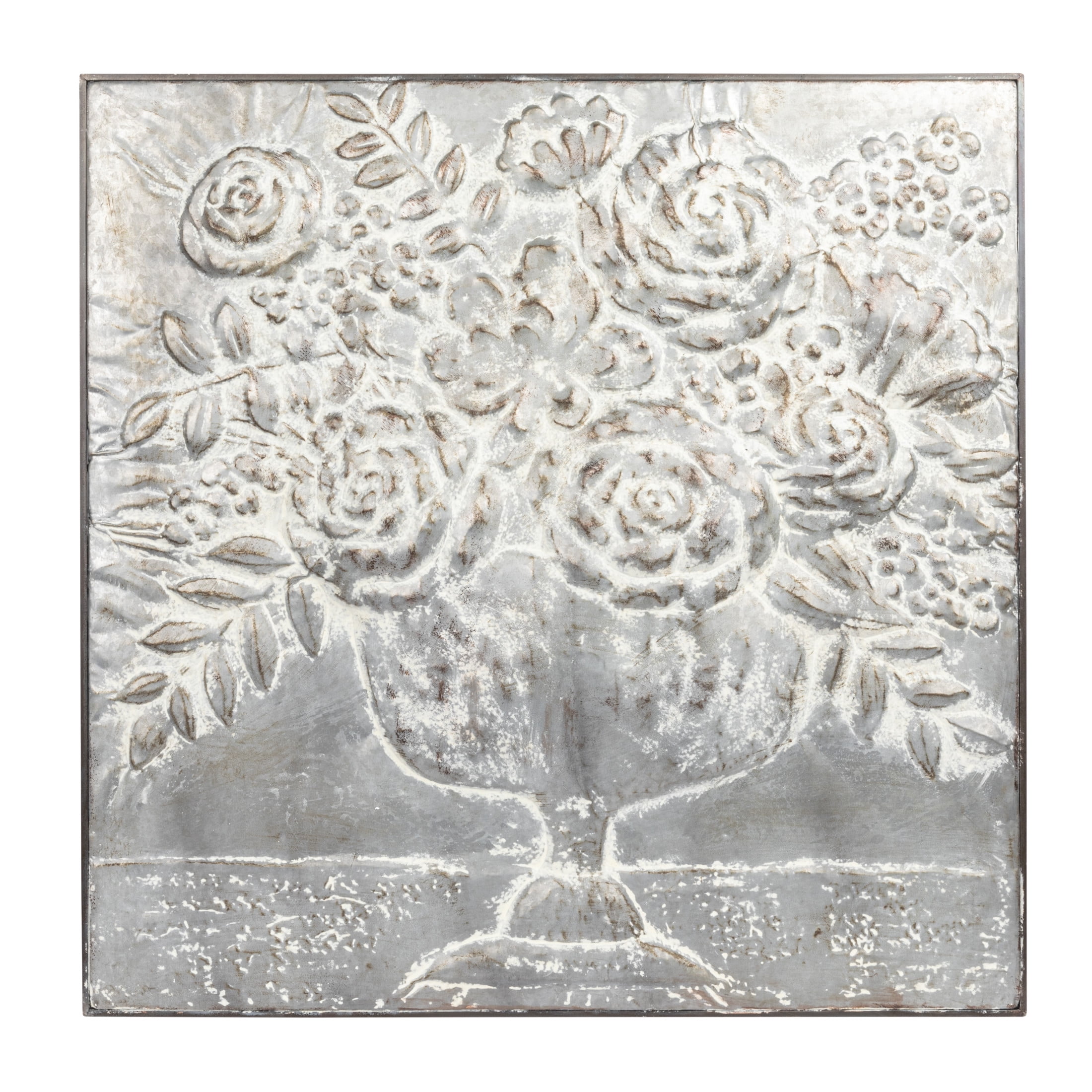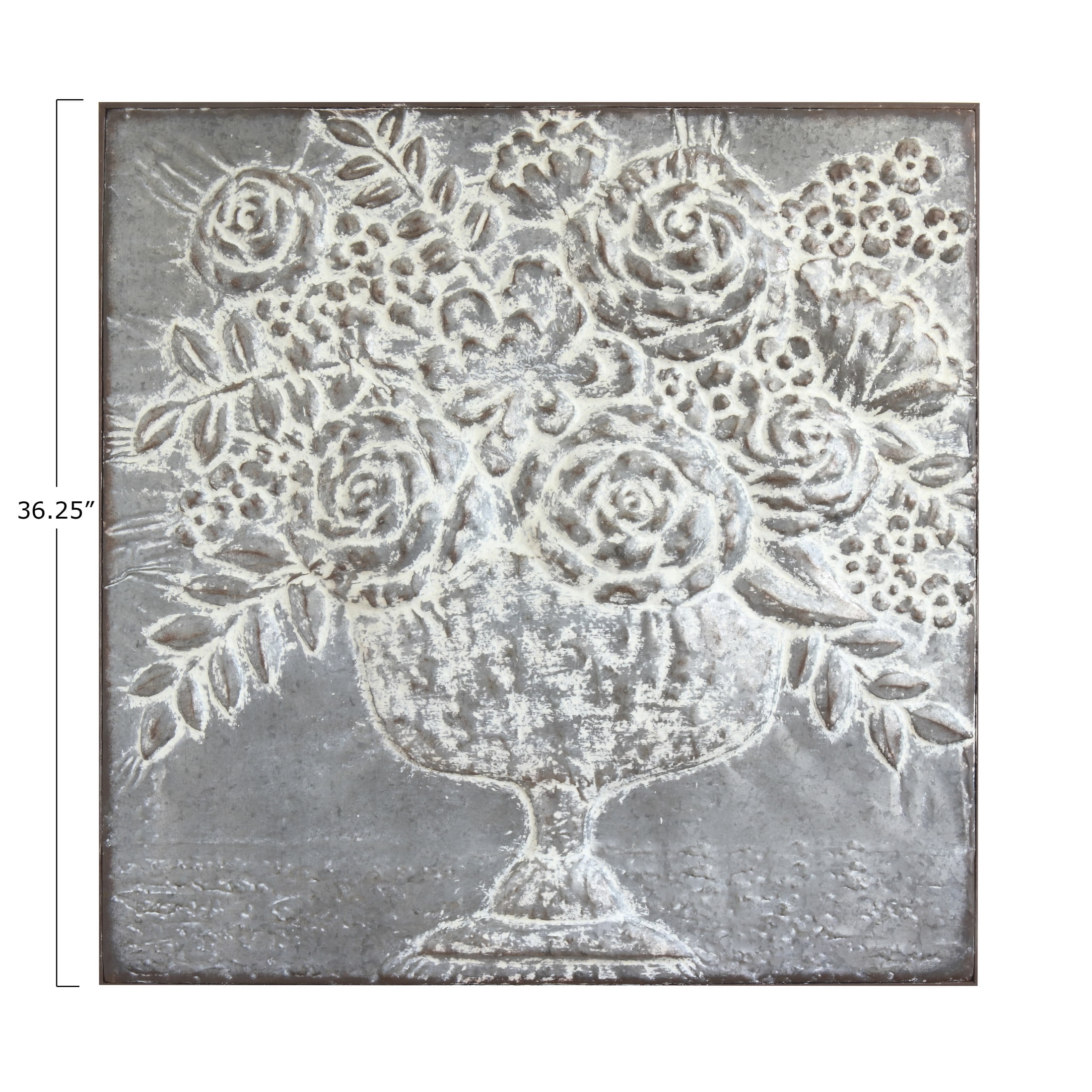 A gorgeous and elegant wall décor piece that features a square metal frame with embossed floral bouquets in various colors This wall décor piece is perfect for adding some vintage and romantic charm to the home, especially shabby chic, farmhouse, or French country These wall décor pieces have an integrated hanging mechanism that can hang them vertically This wall décor piece is made of metal This wall décor piece measures 36.25 inches long and 36.25 inches high Metal construction