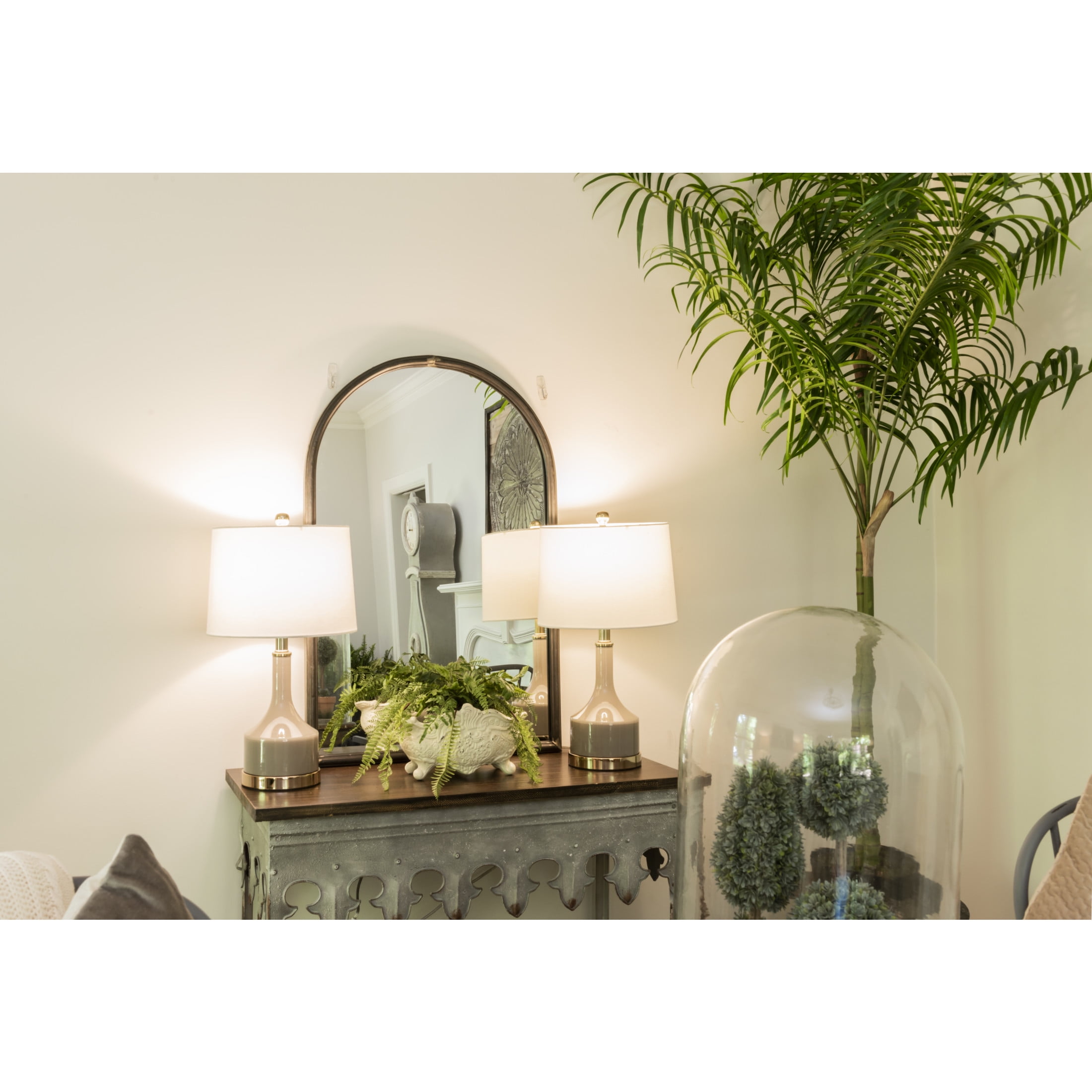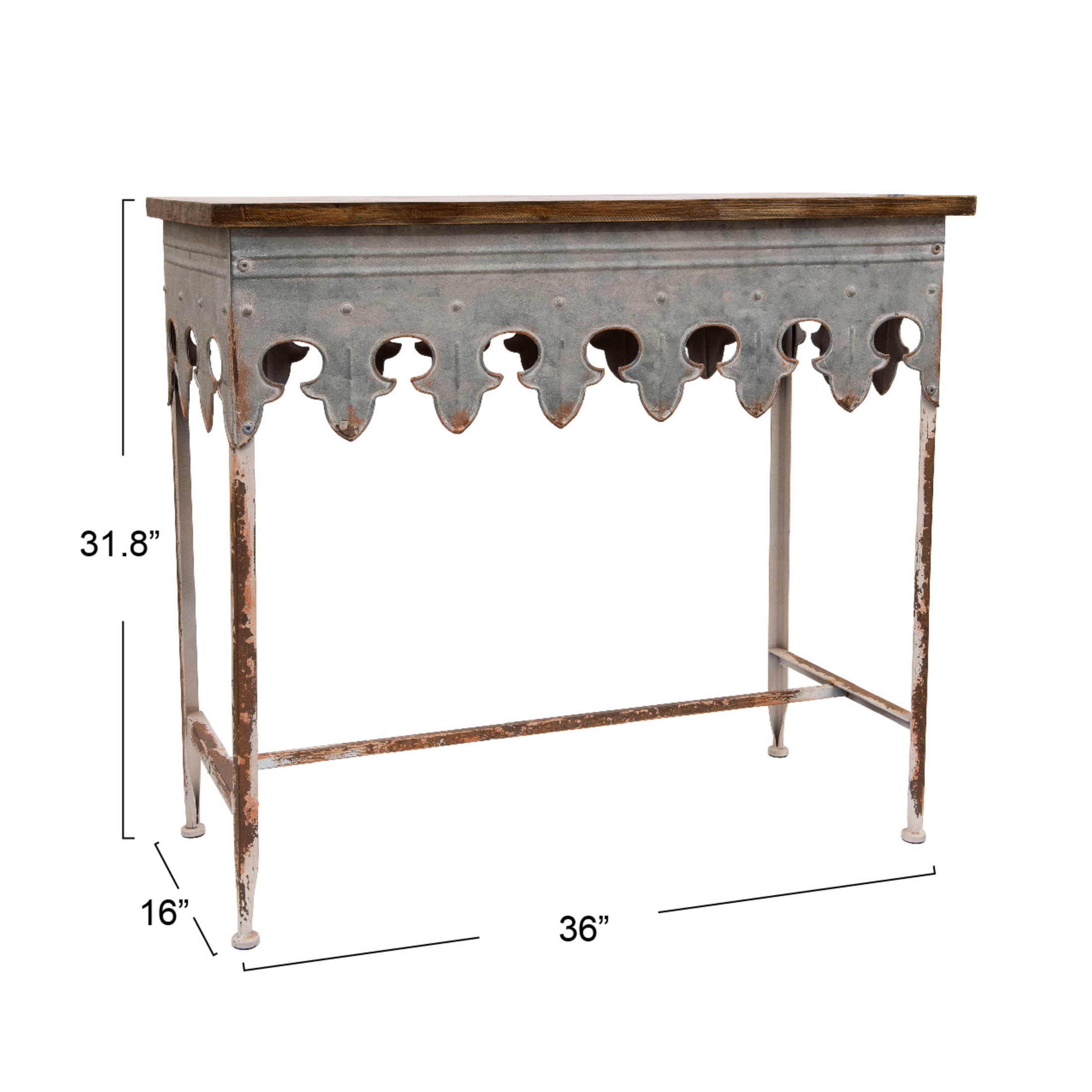 A charming and rustic table with a scalloped metal edge and a wood top Ideal for adding some farmhouse flair to any entryway, hallway, or living room Features a spacious and sturdy wood top that can hold décor items, plants, baskets, or books Made of metal and fir wood, with a hand-finished zinc coating that gives it a vintage and weathered look The table measures 36 inches in length, 16 inches in width, and 31.75 inches in height