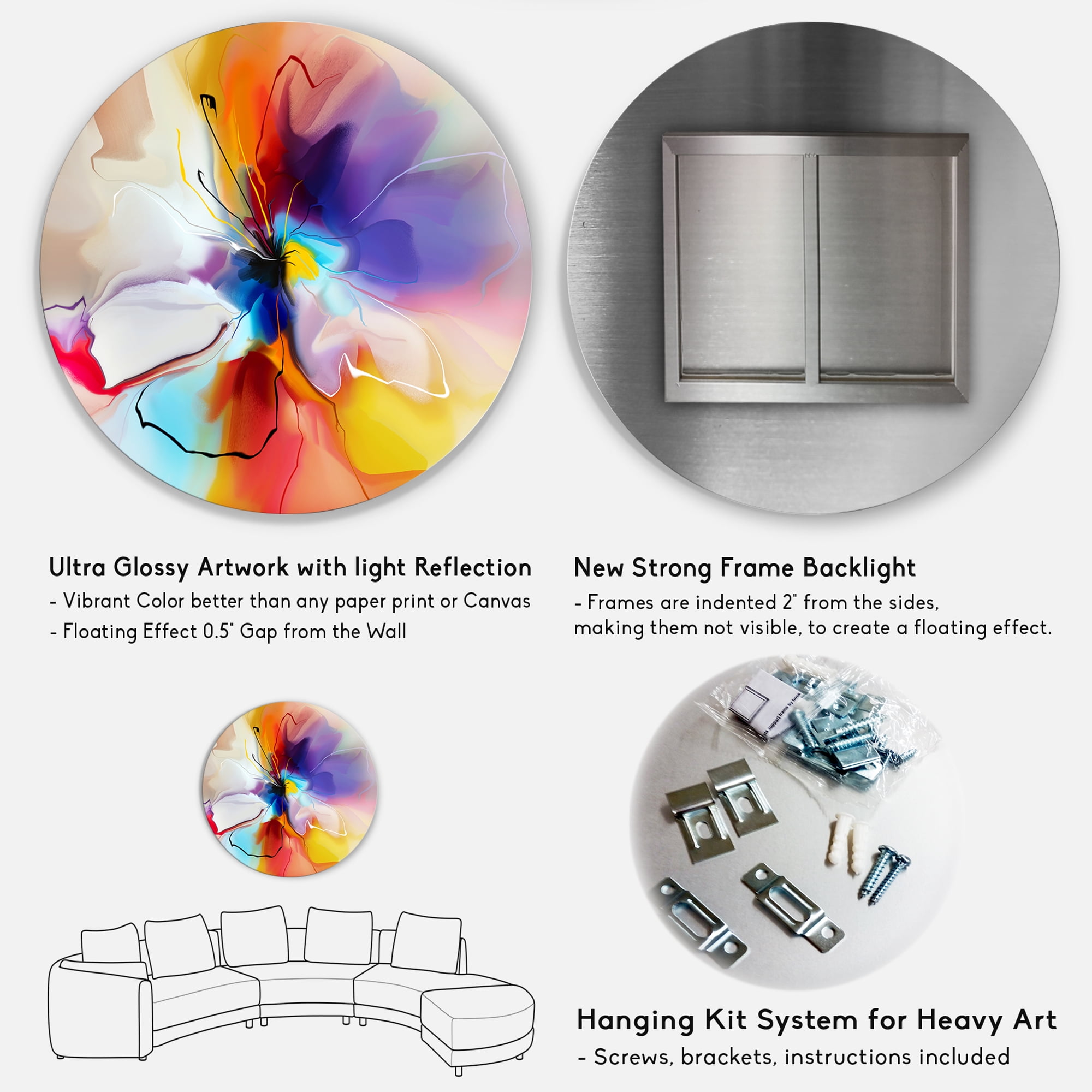 Bring Contemporary Abstraction to your home with this Multi-Color Circle metal wall art. Available in several sizes, this Creative Flower in Multiple Colors Metal Artwork makes it the focal point of any room or office. White Gloss Coating ensures colors are extra vibrant with light reflection. 1-inch mounting frame gives the illusion of artwork floating on the wall. Mounting brackets and instructions are included.