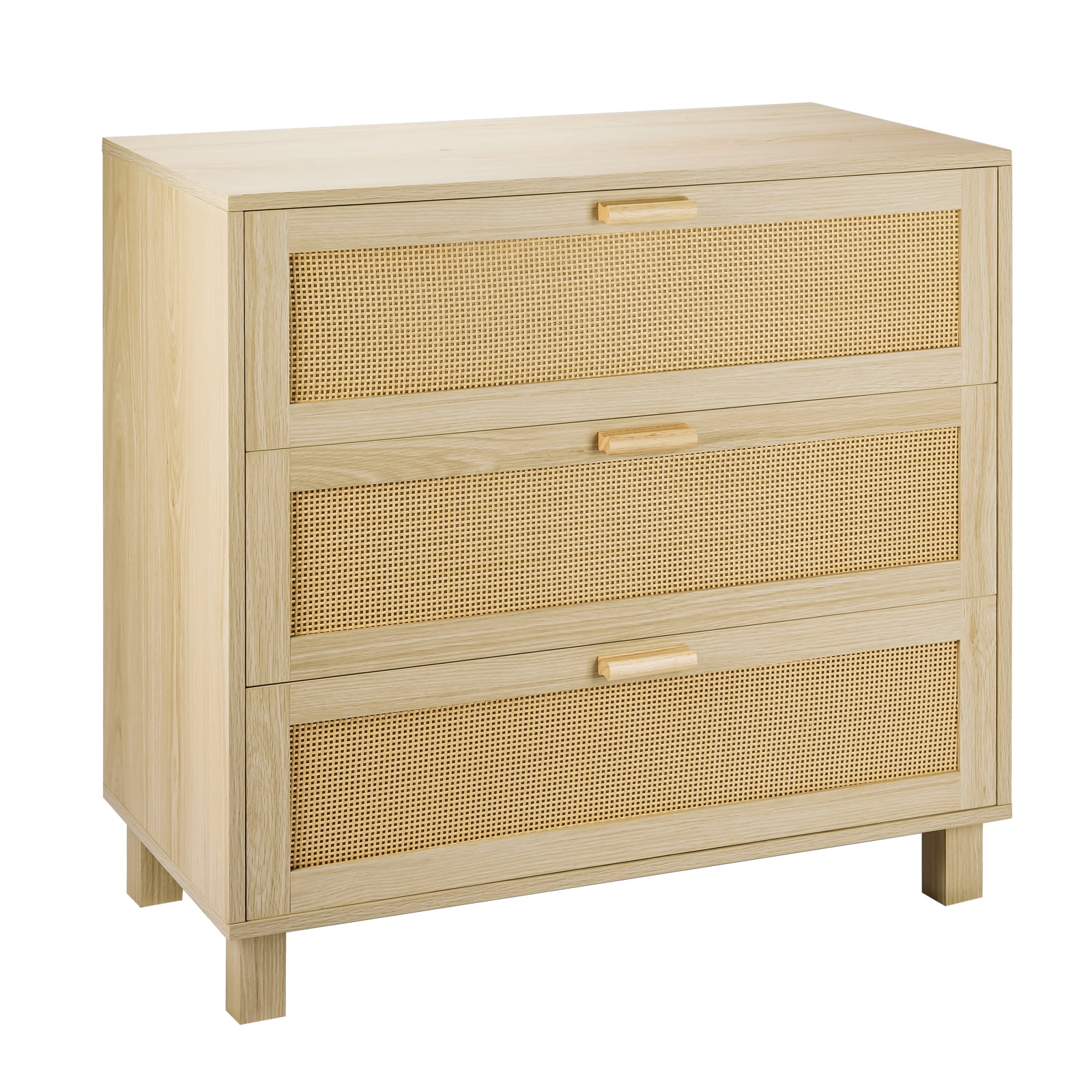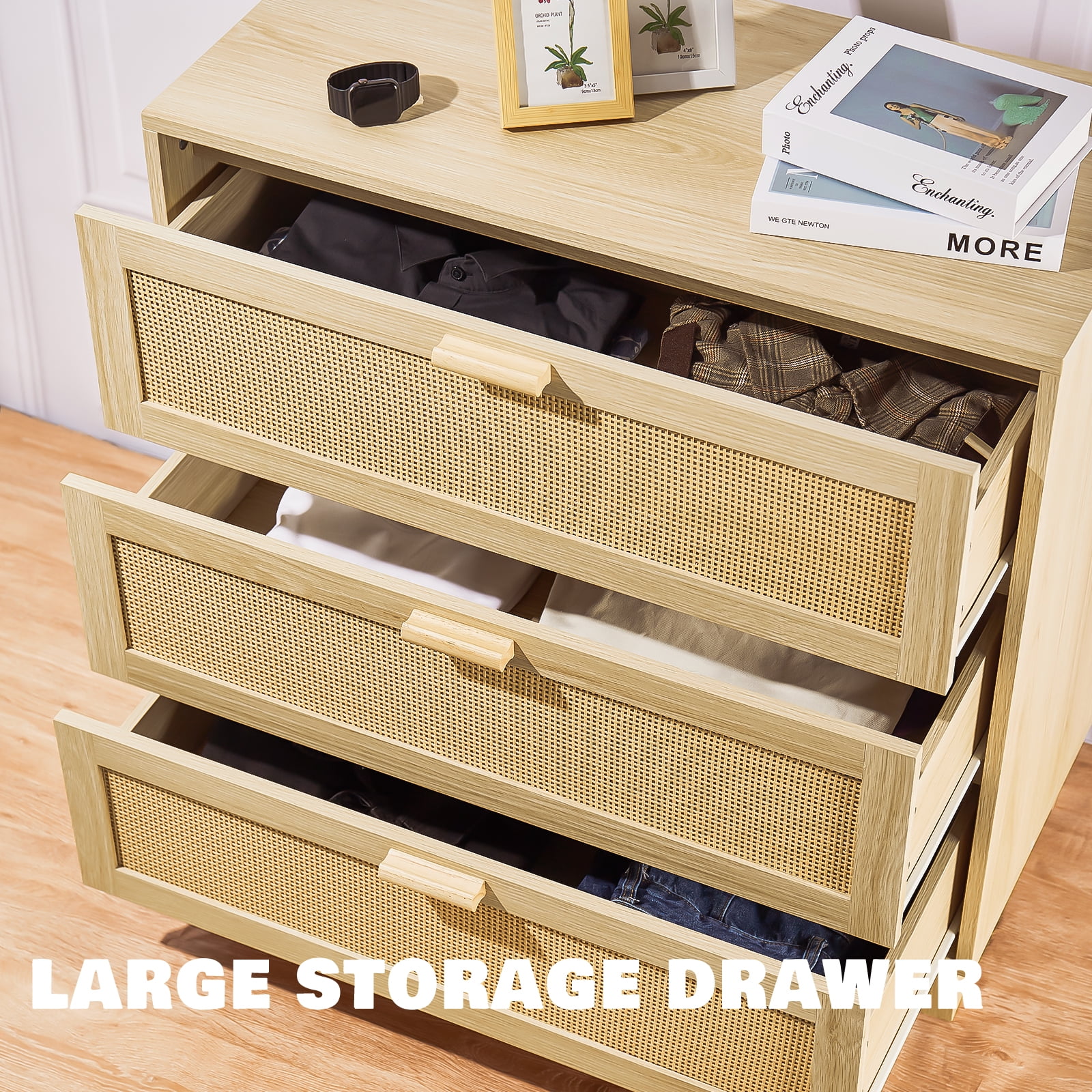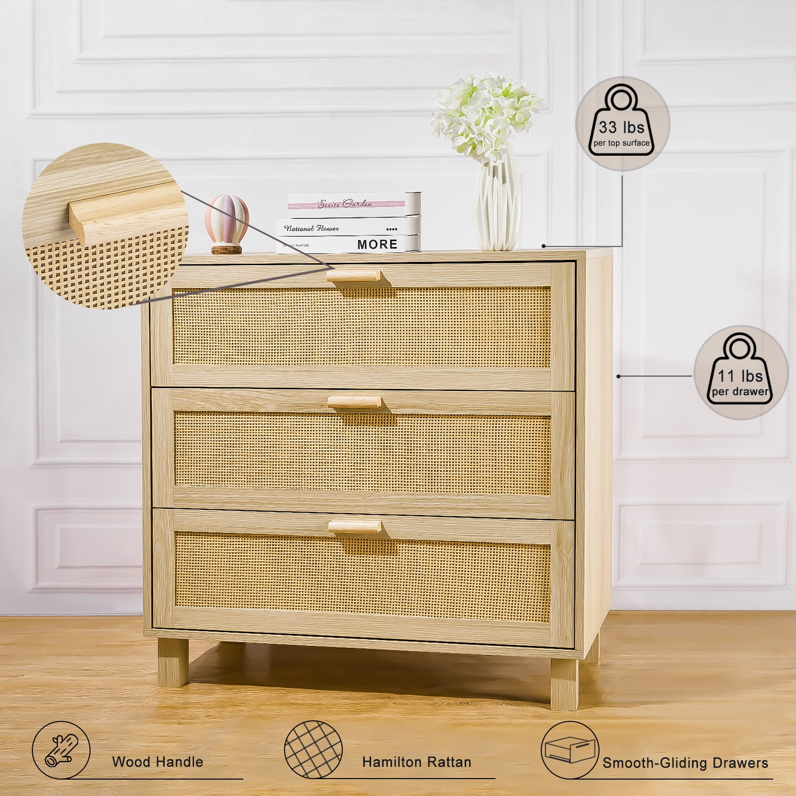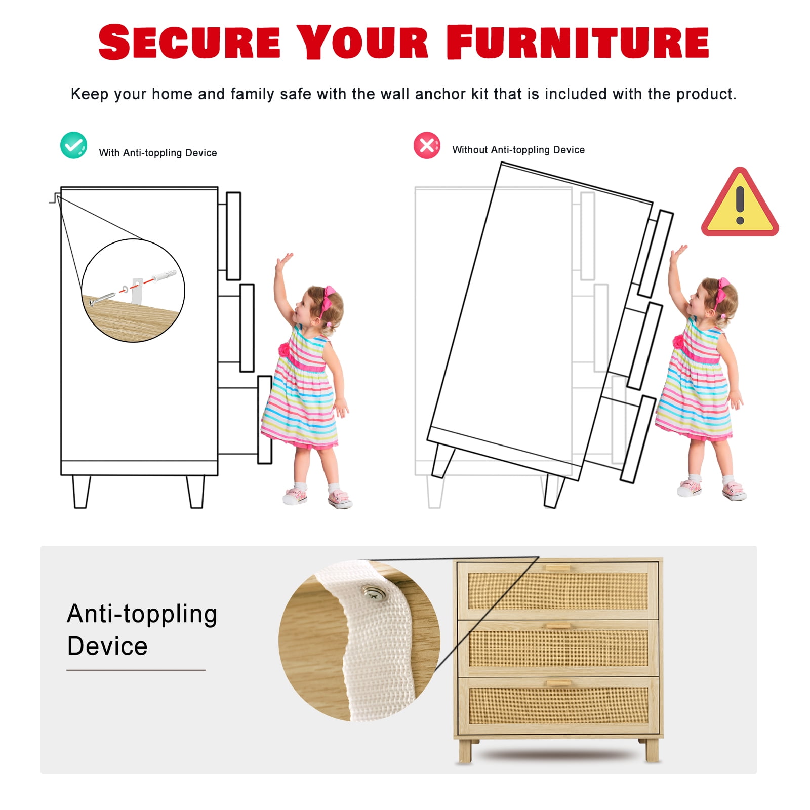Key Features: 【CHEST OF DRAWERS】Rattan Dressers with a spacious tabletop and 3 drawers, this cabinet provides ample storage space. 【DURABLE MATERIAL】The Corner Drawer Dresser made of solid particle board, it’s sturdy and safe enough to support long-lasting use. Surface finish as melamine and with is more durable and not scratch easily. 【EXQUISITE USEFUL】Rustic yet sophisticated, this rattan end table is a practical yet stylish piece that would look amazing in any living space. It’s perfect for storing all your living essentials, update your bedroom décor with this gorgeous piece. 【MULTIPURPOSE】The corner bedside table can work in bedroom, kitchen, living room or entryway to add storage space. Natural surface and delicate rattan-weaved panels will bring a touch of elegance to home. 【EASY ASSEMBLE】 Includes assembly manual and all necessary hardware and fasteners. A wall anchor kit is included to secure the nightstand to the wall and prevent tipping injuries. 【CARE INSTRUCTION】 To prolong the life and appearance of this product keep in a dry area, away from direct sunlight. 【WARNING】 Prevent tip-over injury or death. Furniture with included restraints must be secured to the wall according to the product’s assembly instructions. Specifications: – Material: Particle Board + Oxford Rattan+ Metal – Overall Dimension: 31.5W”X15.75”D X 31.4”H – Drawer Dimension: 28.3W”X11.2”D X 7.8”H – Net Weight: 55.16 lbs – Weight Capacity of Table Top : 33 lbs/Each Drawer: 11 lbs