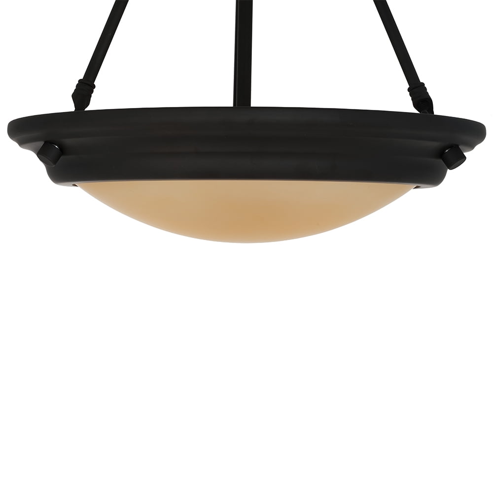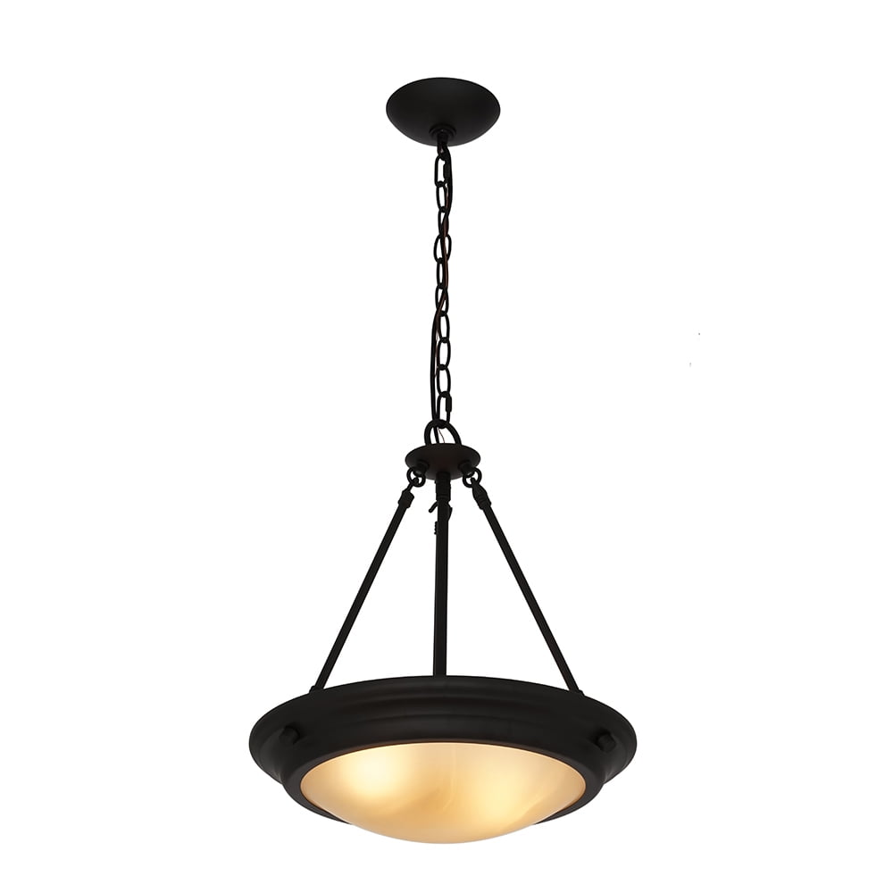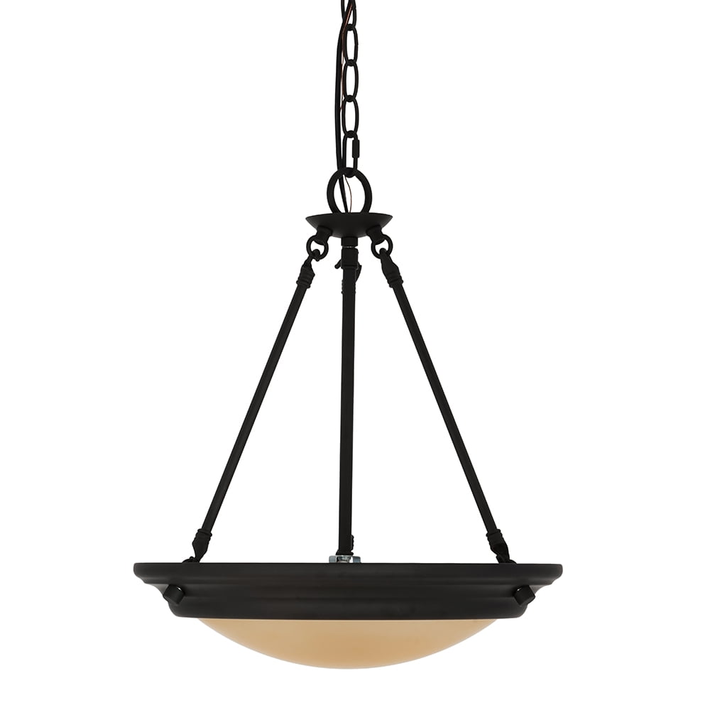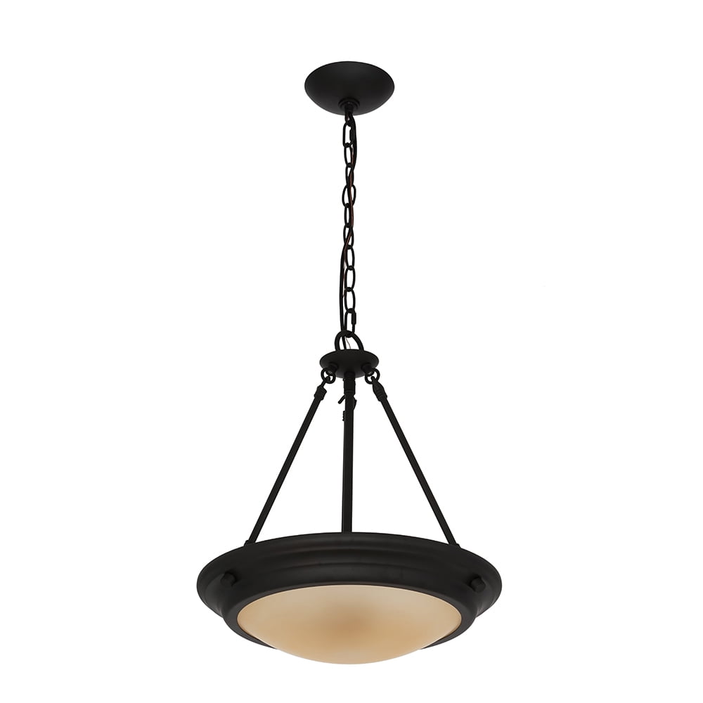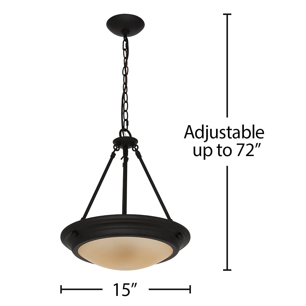 2-light pendant; dark bronze; 15″D frosted-amber glass shade; adjustable height 2 lights with an amber frosted glass shade to help disperse light throughout the room. Includes 60″ of chain and 72″ of wire for adjustability. Traditional design in a dark bronze finish paired with a frosted glass shade makes this the perfect pendant to add a touch of sophistication to kitchen or dining room. (2) 4-watt energy-efficient, cost-saving, warm white (2700K) LED bulbs are included for your convenience. Assembled Dimensions: 17.75″H x 15″W x 15″L; hanging length: 18″–72″H Simple Assembly, assemble in 30 minutes or less