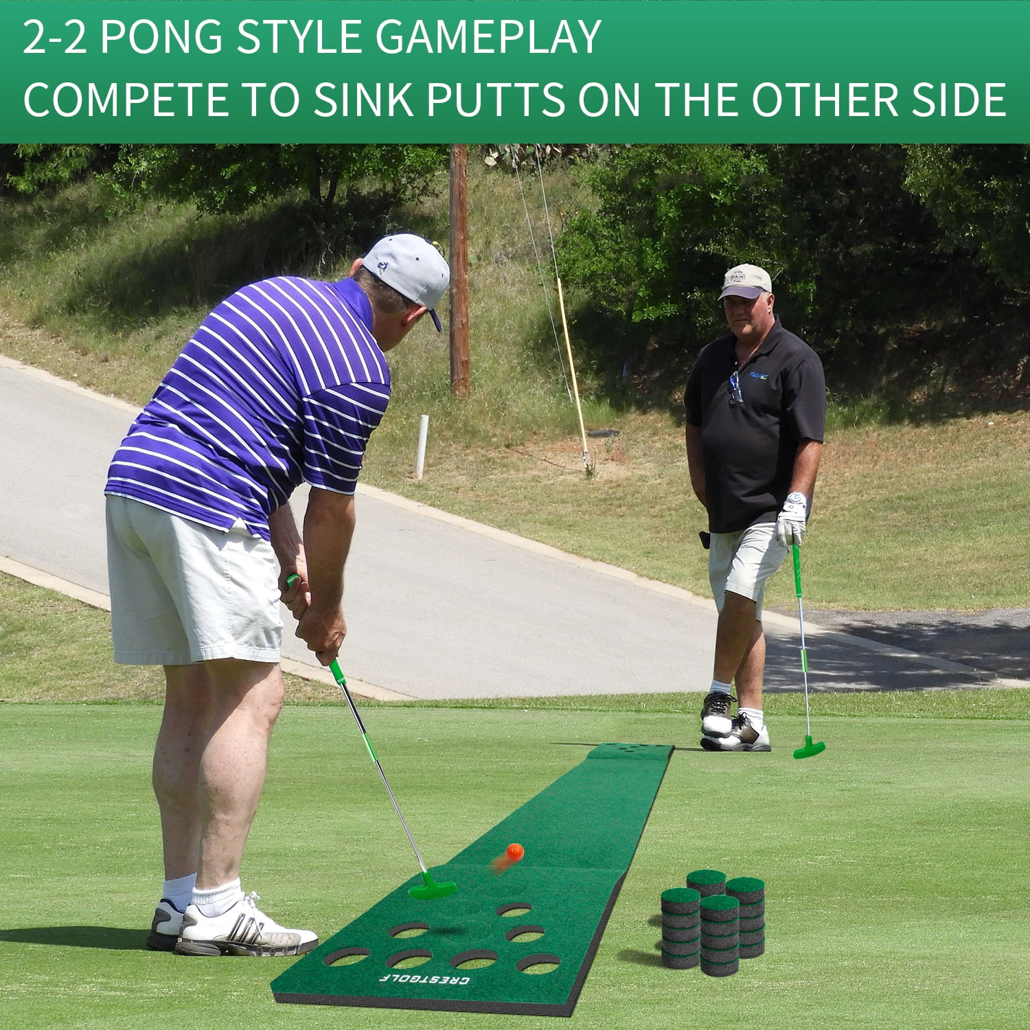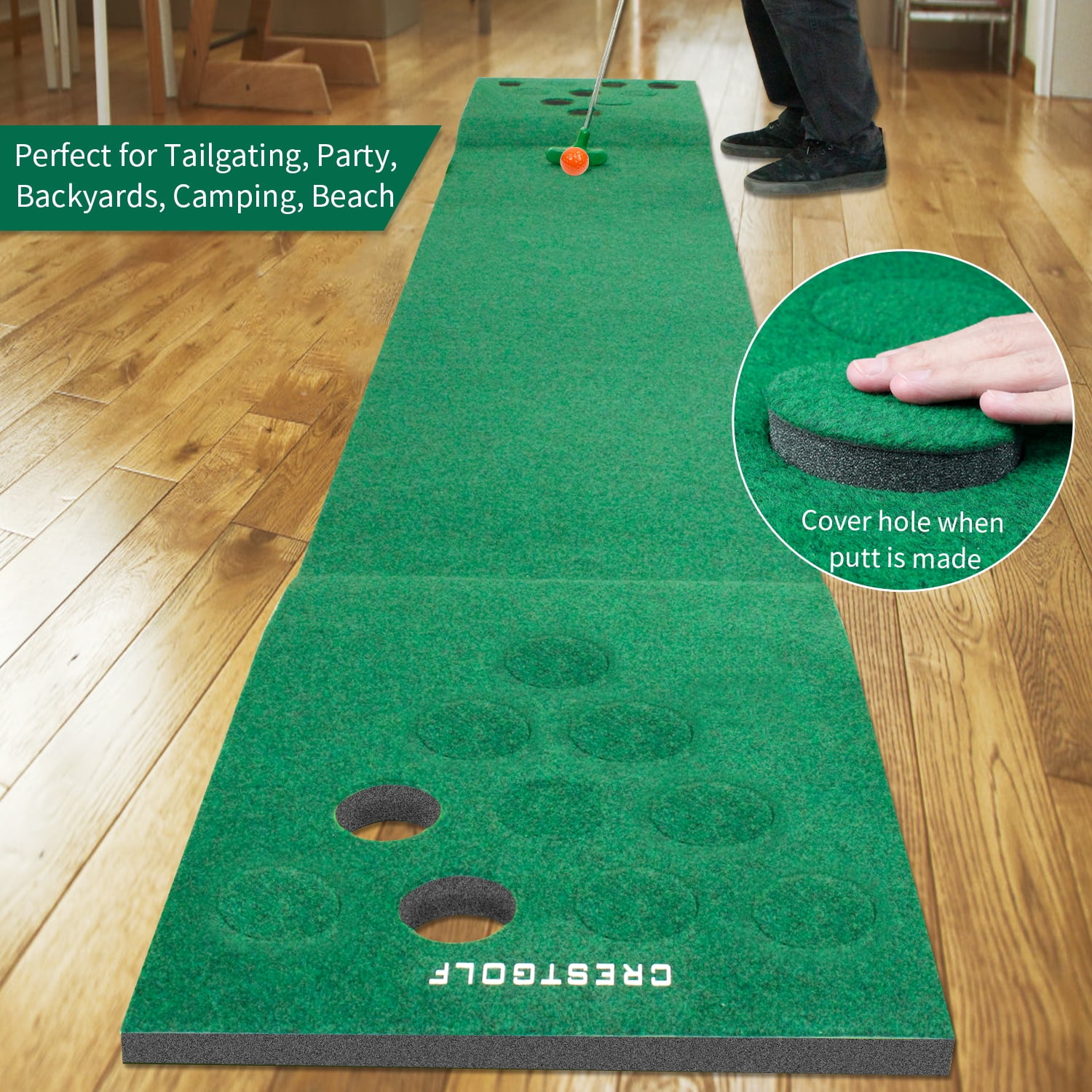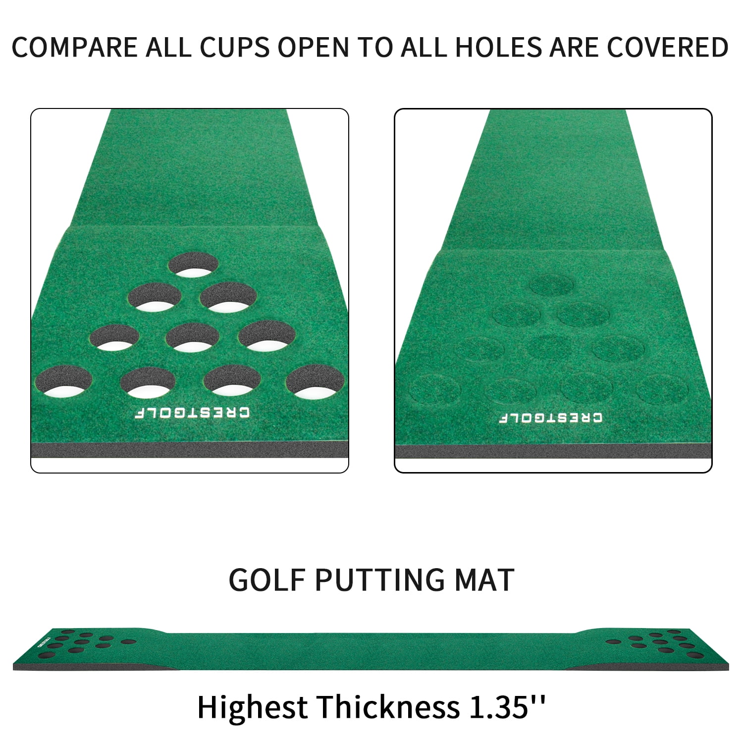 CREATIVE and COMPETITIVE COMBINATION:This golf green putting mat meets your expectation to enjoy golf and drinking at the same time. Playing putting mat is extremely easy and the combination of golfing and drinking is a blast to play! PRACTICE ALL SKILL PUTTING LEVELS : There are 10 holes on each side of the mat. You can compete with your friends or relatives.The one who advances 10 holes wins victory.When the ball into the holes, you can use hole coves to fill it up. EASY TO SET UP & STORE: Indoor putting green is designed to be portable and sets up in seconds. It is ideal for your home, backyard, balcony, living room, office, etc. And it is very practical to benefit your health and makes your social activities more fun. PREMIUM PUTTING GREEN & 2PUTTERS &10 BALLS : The Crestgolf anti-skid mat board is made of high quality and high-density foam.The putters are made of stainless aluminum metal,all 10 balls have numbers, adding more interest to the game.