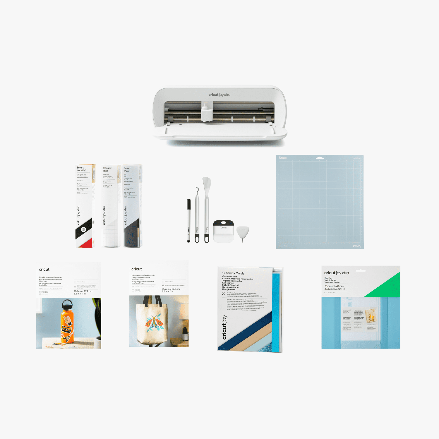 The Cricut Joy Xtra Smart cutting machine + Starter Kit is everything you need to start making! The compact and portable Cricut Joy Xtra™ cutting machine plus receive out of the box all the materials and tools to make popular projects like full-color stickers, T-shirts, cards, vinyl decals & more. Starter Bundle includes: Cricut Joy Xtra machine Premium Fine-Point Blade + Housing Cricut Joy™ Fine Point Pen