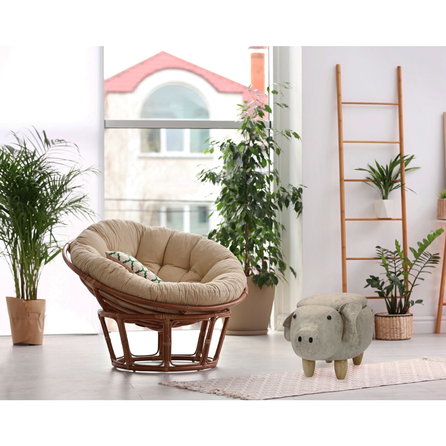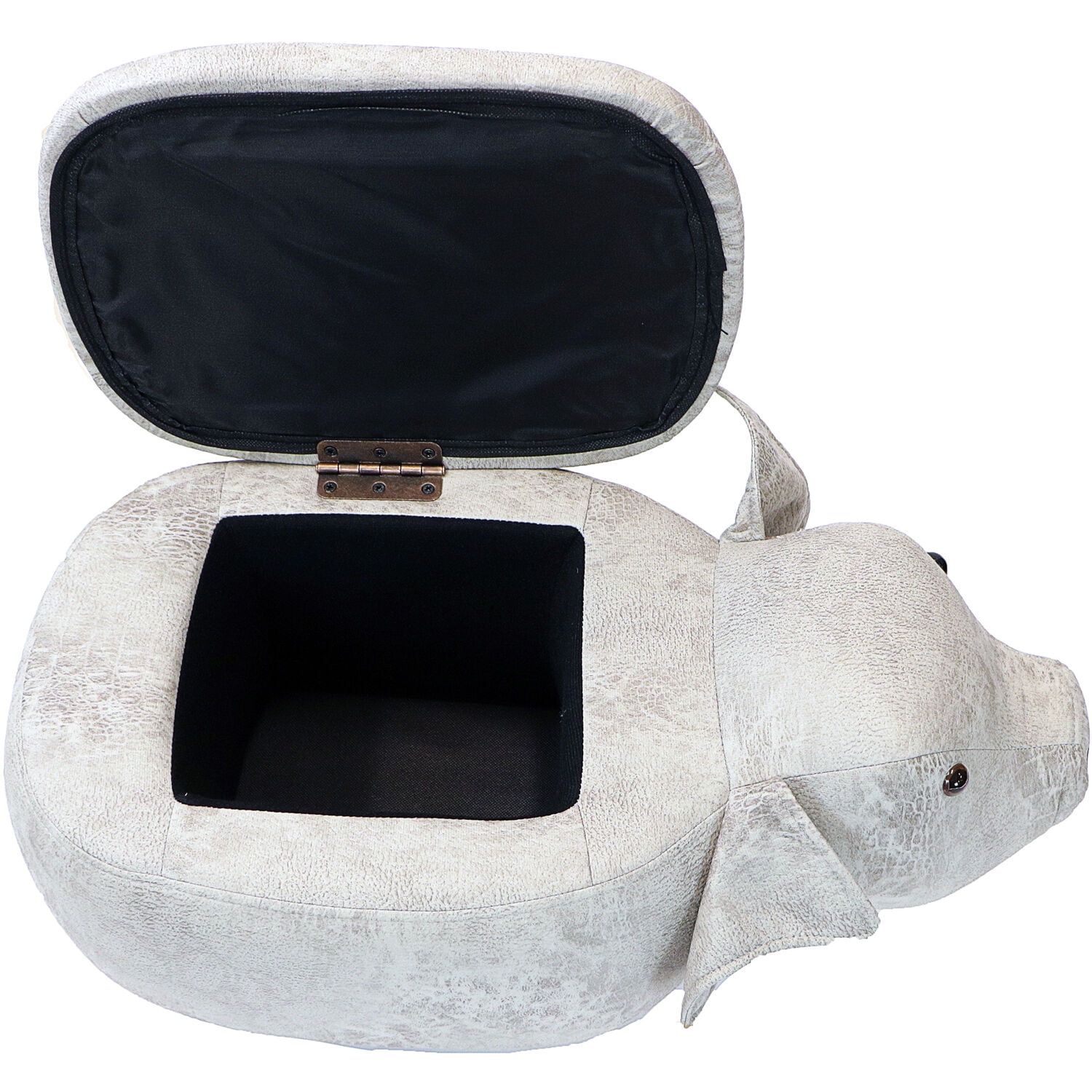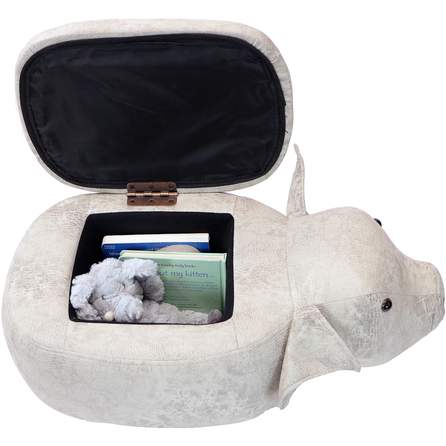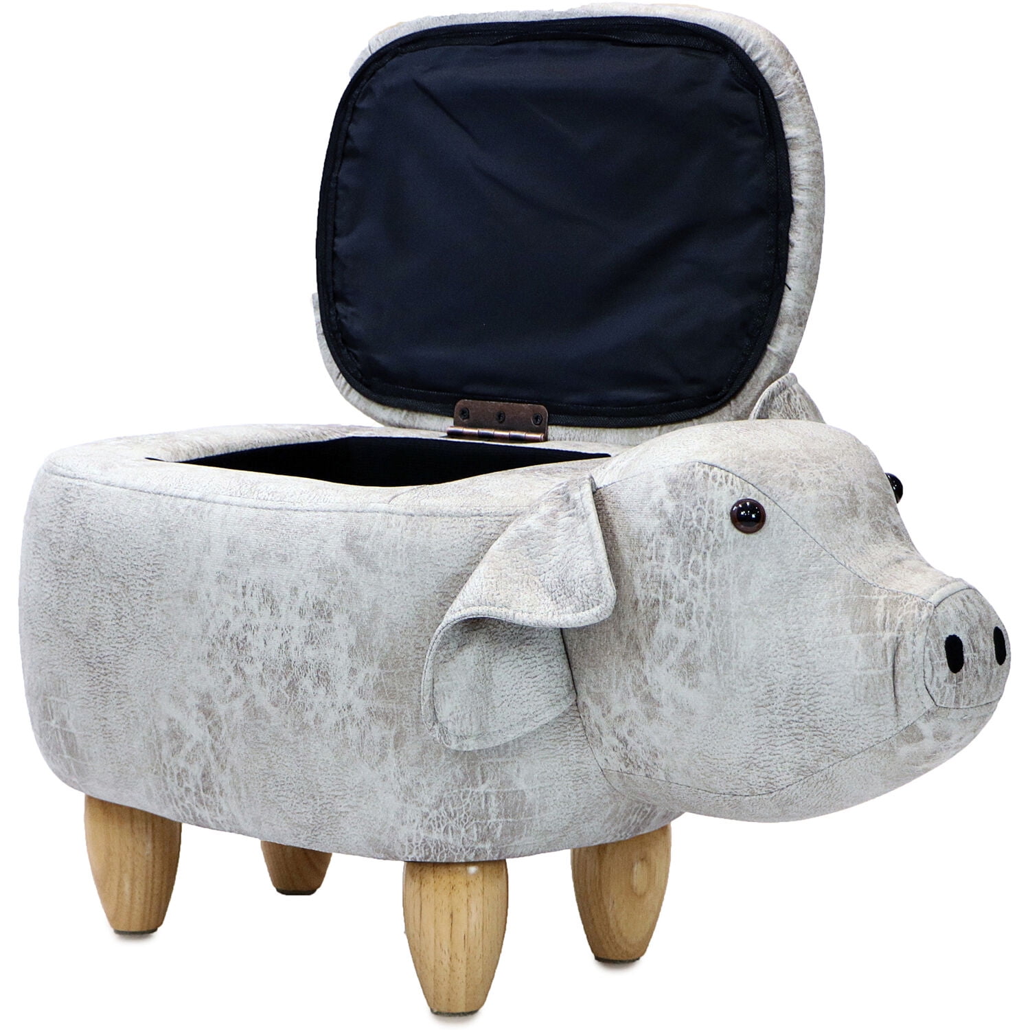 CUTE ANIMAL STORAGE OTTOMAN: Oink! Oink! Use this multifunctional pig as whimsical decor in a living room, kids room, nursery or playroom. Open the hinged lid to a creative, hidden solution for toys, electronics and books. Adults and kids alike will fall in love with this adorable little stool. SOFT AND COMFORTABLE: Soft faux-leather is comfortable enough to rest your feet on or sit on. Use it as a footstool under your desk or as an accent piece. Your small pets will love lounging on this high-quality cushioned stool whenever they can. DURABLE AND STRONG: Firm, sturdy legs provide safety and stability. Felt furniture pads on the feet allow you to move it without damaging your floors. The material is easy to spot clean and will provide years of fun. The assembly couldn’t be easier; simply screw the legs on, attach the felt pads, and enjoy! GENEROUS SIZE: This unique and playful pig furniture is 14”L x 26”W x 15″H – the perfect size for any room in your house no matter the style. Fun and stylish animal-shape cushioned furniture designed for sitting, resting your feet, and small-item storage Playful accent for baby’s nursery, toddler’s bedroom, children’s playroom, family room, living room or any area Choose from a large variety of cute animal shapes – pair this footrest with your favorite chair Animal character seating is ideal for your farm theme or zoo theme decor Storage lid attached with single hinge and secured with hook & loop closure Four strong, sturdy rubberwood legs keep this footstool stable and safe (300-lb. weight capacity) Thick comfortable padding provides extra comfort for kids and adults alike High-quality fabric for quick and easy spot cleaning adorns this hassock Durable stitching holds well for everyday use Felt attached to bottom of legs to prevent scuff marks Quick and easy leg assembly required 1 year warranty Seat Height (from seat to floor): 15 inches Leg Height (from belly to floor): 4 inches Storage Cavity Dimensions: 7.5″L x 9″W x 8″H
