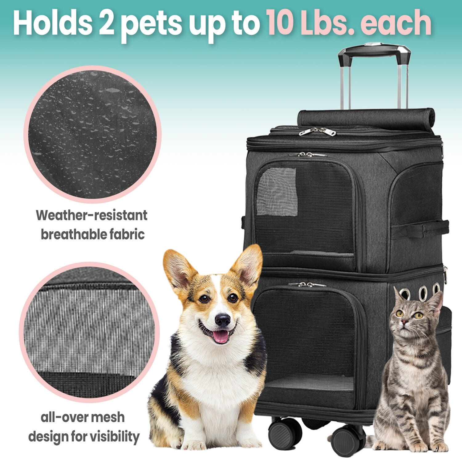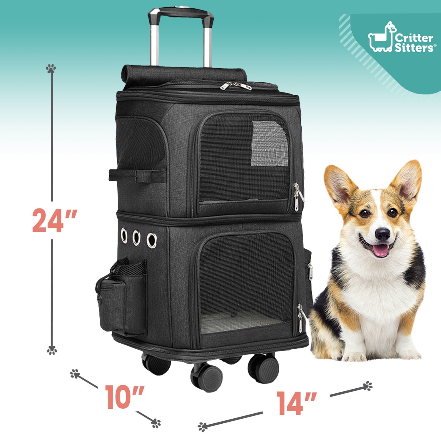 DOUBLE DECKER DESIGN: This pet carrier has two separate compartments for 2 small pets in two separate compartments or use one section for storage of treats, clothing. The perfect carrier for transporting multiple small pets, in the upper section 22lbs and 22 lbs bottom section. CONVENIENCE IS KEY: Whether your pet is small or medium sized, our breathable and spacious backpack carrier is perfect for travel or daily activities! The top zip entry allows you to comfortably place your pet inside, with an additonal side window for venilation. ADJUSTABLE HANDLE: With our telescopic adjustable handle, you can customize the length so that transporting your pet will always be a comfortable and enjoyable experience. SAFETY FIRST: Secure your pet by clipping your dog or cat’s collar/harness to the pet safety leash built in the bookbag! STORAGE: Perfect for traveling, this bookbag can transport your fuzzy companion along with storage for all the necessary accessories such as: food, treats, leashes, puppy pads, toys and more! Bring your pet to the vet’s office, to the park, or traveling with Critter Sitters’ Double Decker Rolling Pet Carrier Stylish and functional material protects your pet when you get caught in the rain Zipper entry provides easy access to your pet Adjustable handle extends to 40-in. tall Built-in safety leash keeps pets secure Fits two 10 Lbs. pets Allows pets with paw injuries or senior companions to get outside without having to walk Mesh material provides breathability and acts as a window for your pet to see out of while you adventure 1-year limited warranty with excellent Customer Service Monday through Friday from 9AM to 5PM Rolling Carrier Dimensions (Inches): 14W x 10L x 24H Pet Compartment Dimensions (inches): 14W x 10L x 9H(top) x 9H (bottom) Color: Black