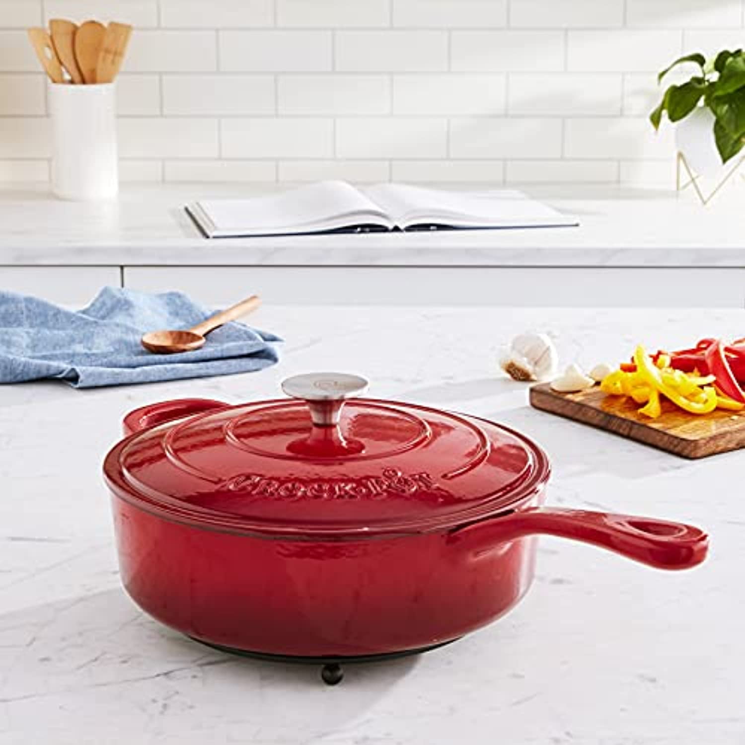 Crock-Pot Artisan 3.5 Quart Deep Enameled Cast Iron Cooking Saute Pan w/Lid, Red