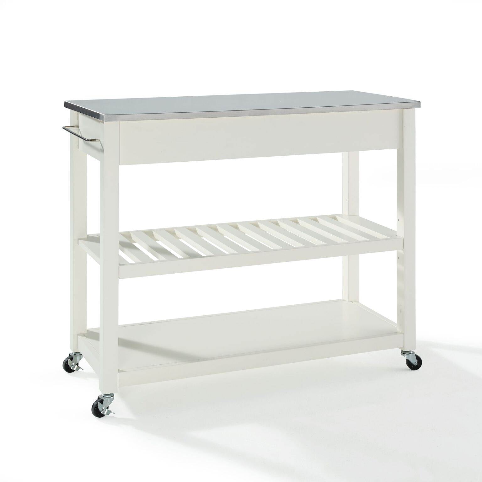 Crosley Furniture Stainless Steel Top Kitchen Cart with Optional Stool Storage: Stainless-steel top Solid hardwood and veneer construction Hand rubbed, multi-step finish Beautiful raised panel drawer fronts Adjustable and removable shelf 2 utility drawers Towel bar Heavy duty caster for mobility Crosley kitchen cart available colors: black, cherry, white